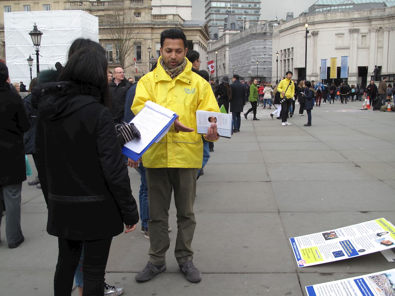 法轮功学员拉悉塔•森纳尼亚克(Lasitha Senanayake)多年来坚持周六在伦敦圣马丁广场讲真相反迫害,在当天庆祝三亿中国人三退活动中,他注意到很多人希望了解法轮大法是什么,于是他在讲真相过程中注重展示法轮大法的美好。
