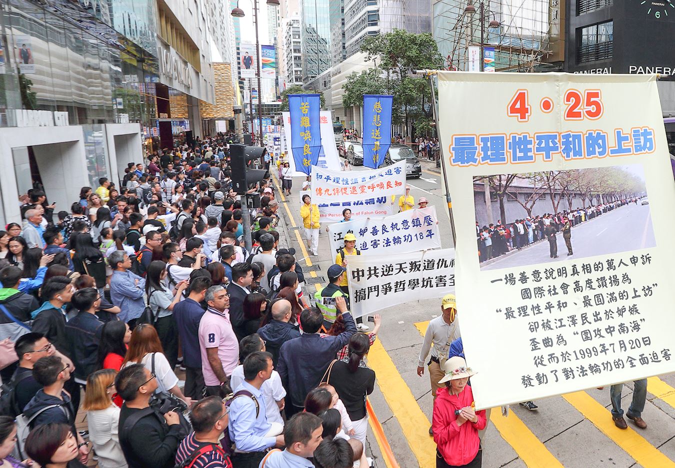 ![]() 图2:四月十五日,香港、亚洲多个地区和国家的部份法轮功学员在香港举行纪念“四·二五”十九周年集会游行,场面震撼不少香港市民及大陆游客。 |