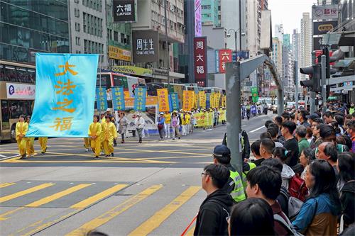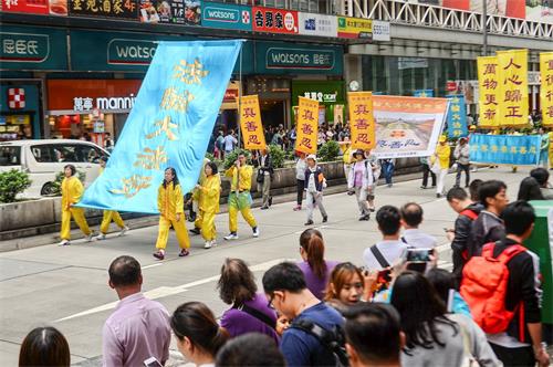 下午天气转好雨也停,约一时半,近千人的游行队伍在天国乐团的领头下从长沙湾游乐场出发,游行分六大方阵,包括“解体中共 复兴中华”、“法轮大法洪传世界”、“和平理性反迫害”、“天灭中共 三退是福”等,各式大型幡旗气势浩荡,并有功法展示队、退党队、花车、花船队、腰鼓队、旗鼓队沿途表演。