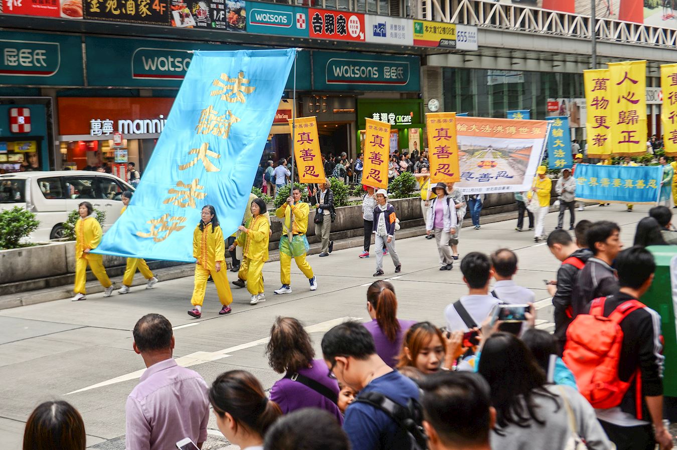 ![]() 图6~12:近千人的游行队伍在天国乐团的领头下从长沙湾游乐场出发,途经游客购物热点,吸引许多人驻足观看和手机拍摄,大陆游客亲眼看到法轮功,很震撼。 |