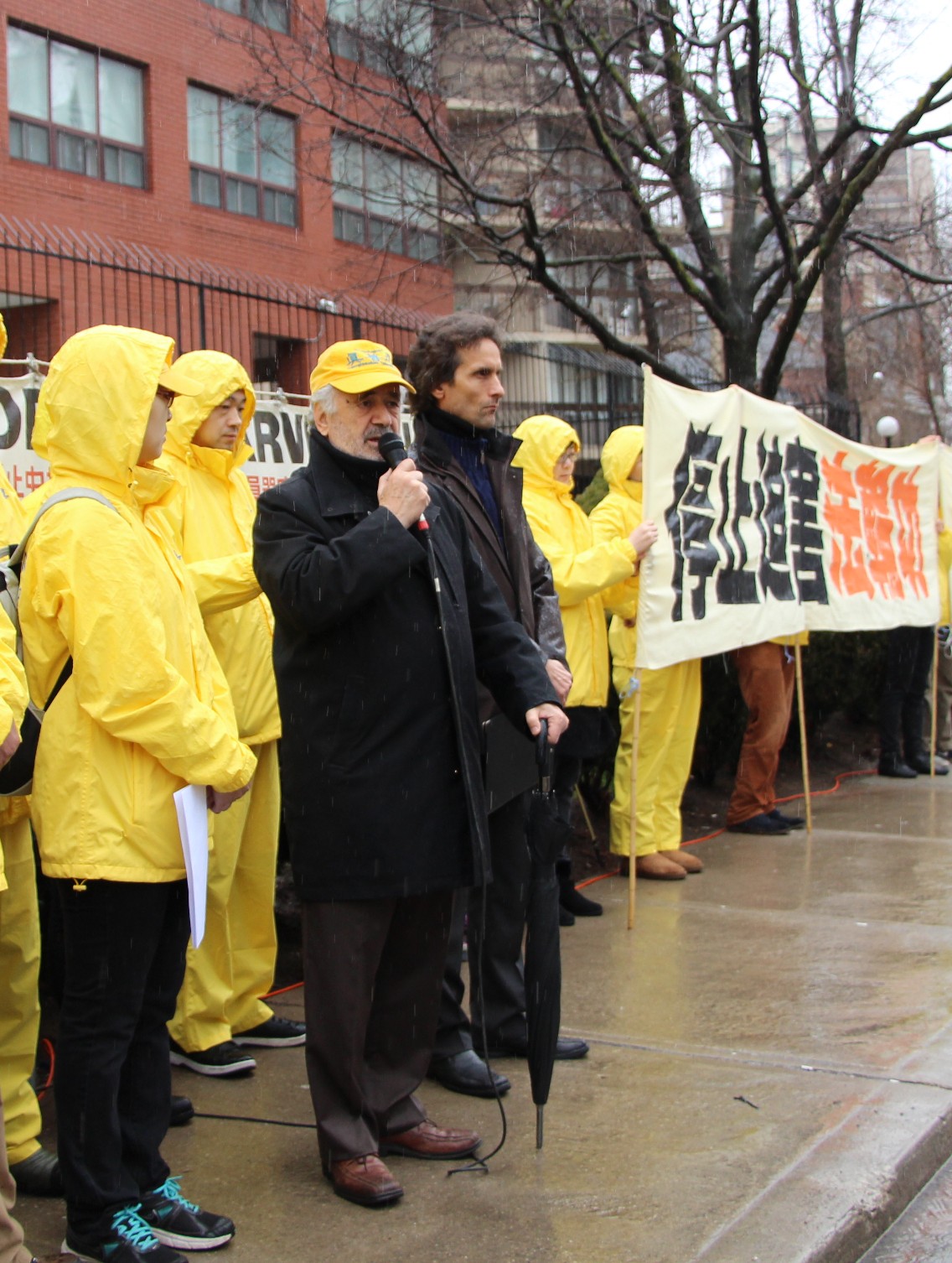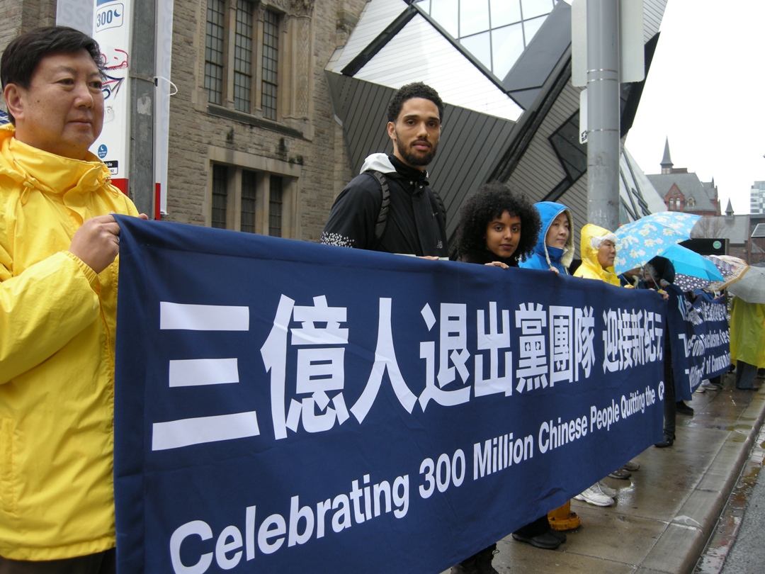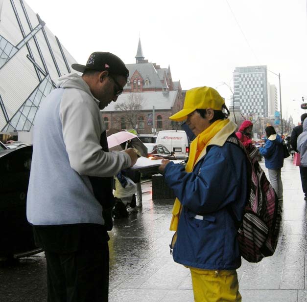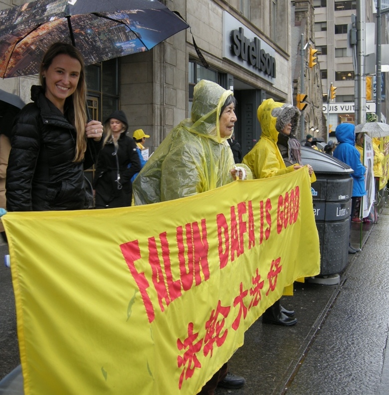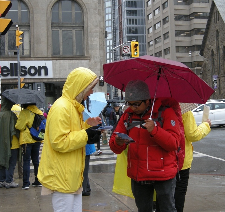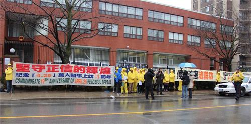 今年的四月二十五日,多伦多整天都下着大雨,风雨中活动照常举办,中午十二点至两点举行 新闻发布会,加拿大前参议员迪尼诺(Con Di Nino)冒雨来到现场,他手拿着的雨伞一直没打开,在风雨中和学员们站在一起到活动结束。