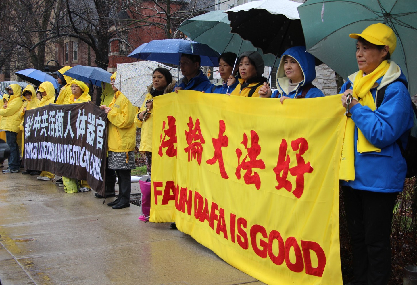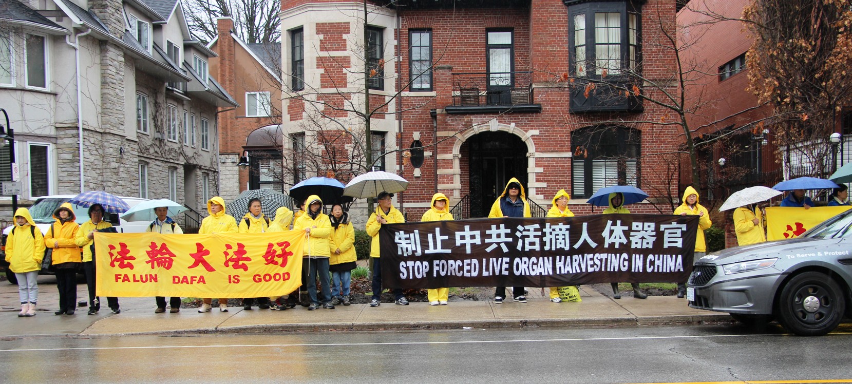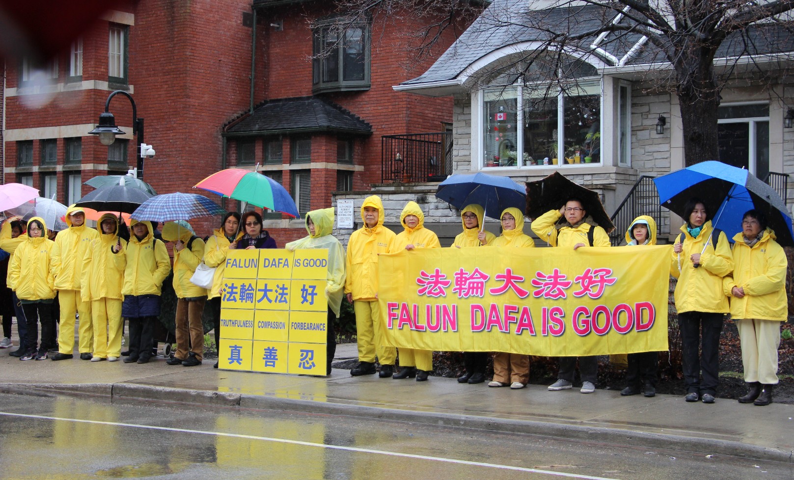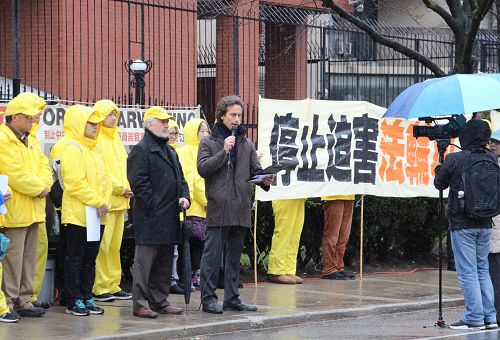今年的四月二十五日,多伦多整天都下着大雨,风雨中活动照常举办,中午十二点至两点举行 新闻发布会,加拿大前参议员迪尼诺(Con Di Nino)冒雨来到现场,他手拿着的雨伞一直没打开,在风雨中和学员们站在一起到活动结束。