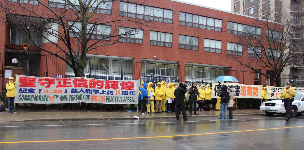 多伦多法轮功学员每年的这一天都在中领馆前举行一系列的纪念活动:中午开新闻发布会,下午是真相长城,晚上是烛光悼念,风雨中悼念着十九年来被中共迫害致死的法轮功学员。