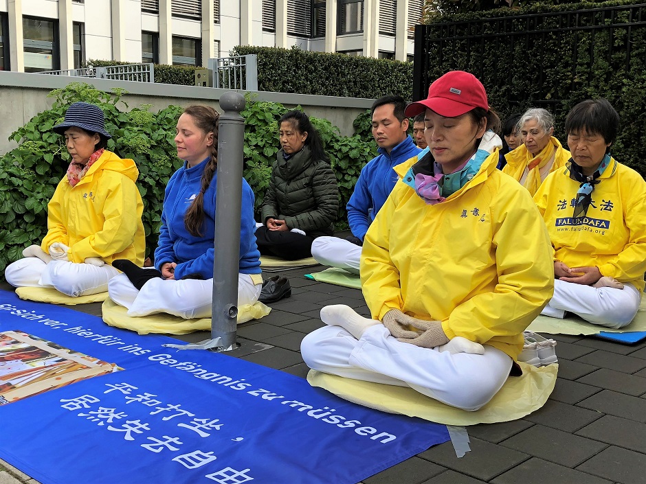 四月二十五日九点至十二点,法轮功学员在中领馆对面拉开以纪念四·二五和平上访为专题的横幅,并集体炼功,发正念。法轮功学员本特纳女士(Bentner)通过扩音器向中领馆工作人员及所有在场民众朗读了一封给驻杜塞尔多夫总领事冯海阳的公开信。