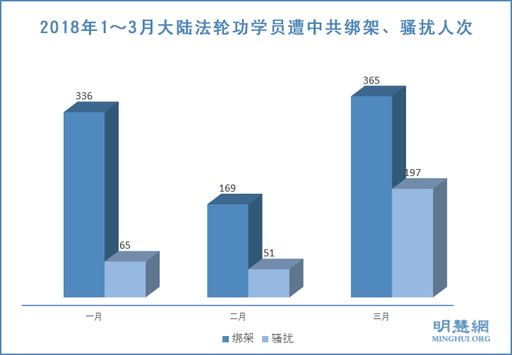 据明慧网信息统计:二零一八年三月份中共绑架法轮功学员365名。