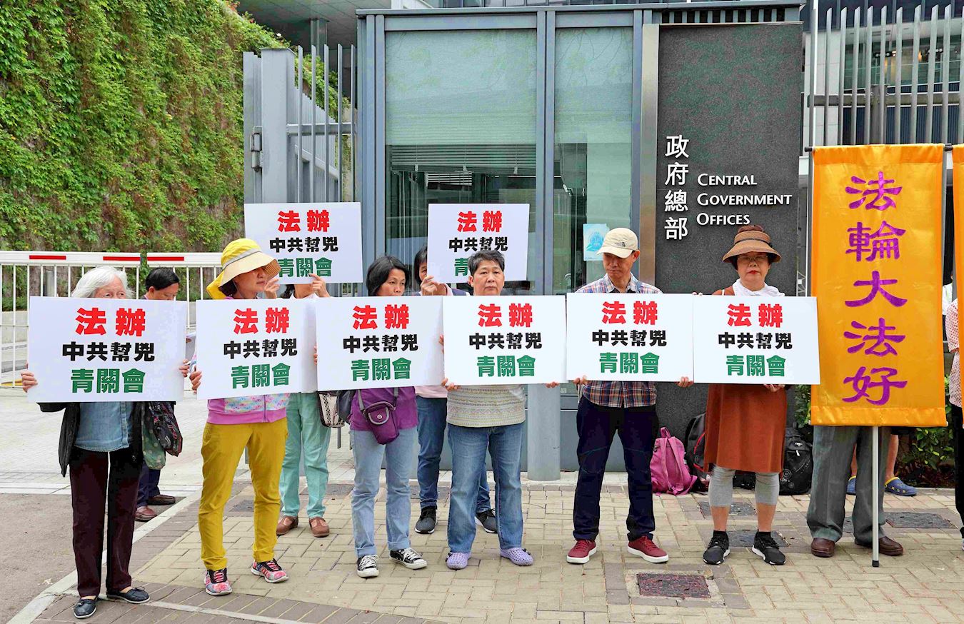 图1:香港法轮功学员在政府总部外集会,敦促港府法办青关会。