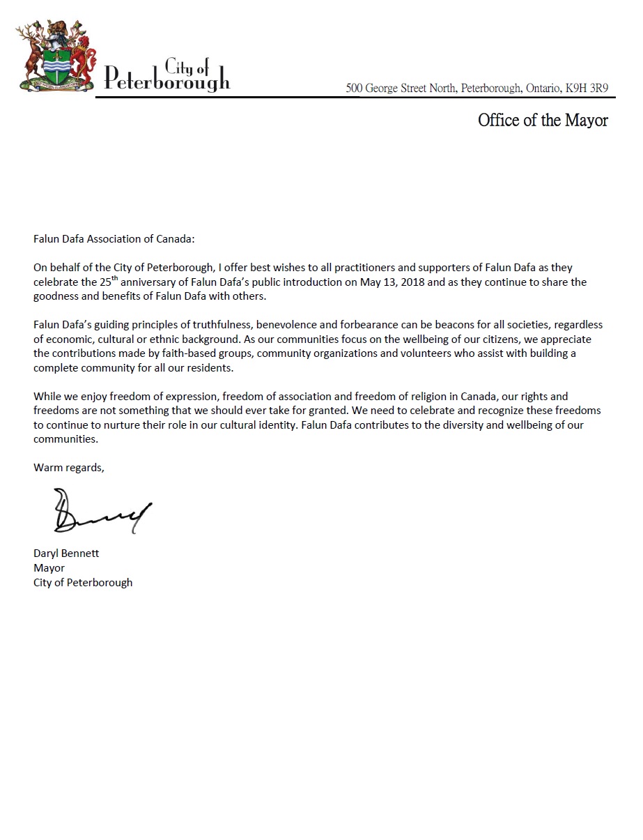 安省彼得堡(Peterborough)市市长Daryl Bennett发出贺信表示:“谨代表彼得堡市,我要向在2018年5月13日庆祝法轮大法传世26周年的法轮大法修炼者和支持者们表达我最衷心的问候,他们一直在不停地与他人分享法轮大法的美德与益处。”