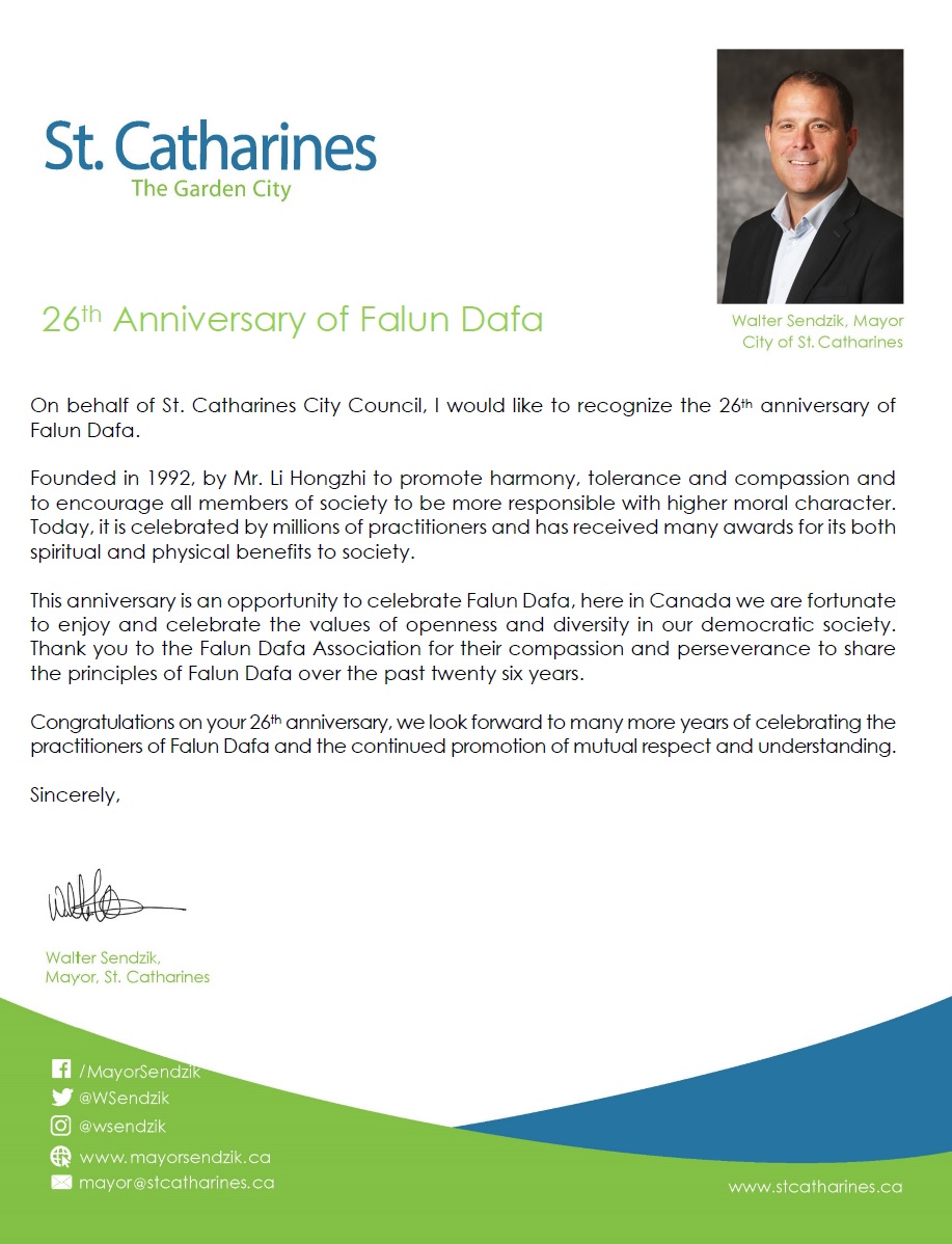 安省圣凯瑟琳市(St. Catharine)市长沃尔特·森慈克(Walter Sendzik)发来贺信庆祝法轮大法传世26周年。