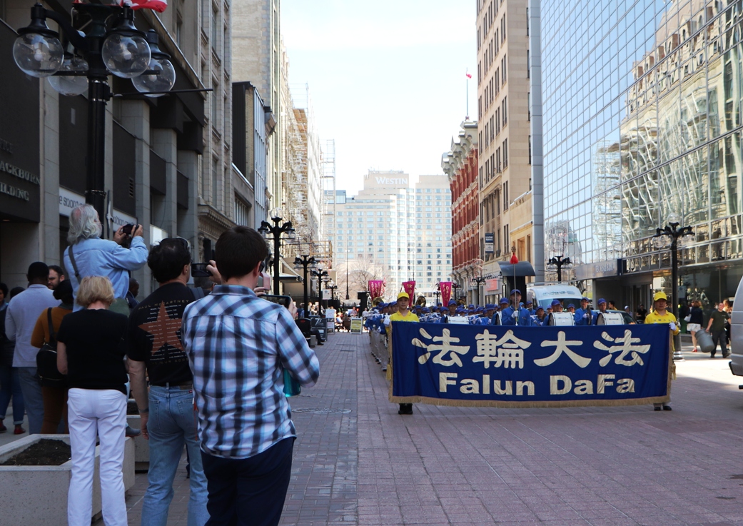 今年七十八岁的彭先生和太太张女士,来自北京,在加拿大已居住了十年。他们一直跟着天国乐团的游行队伍走,张女士兴奋地说:“在电视上看过好多次了,这是第一次亲眼看到,真的很震撼!”知道是庆祝法轮大法日时,彭先生说:“加拿大政府一直非常支持法轮功,总理哈勃在位时就定了法轮大法日。我也祝贺法轮大法日。”