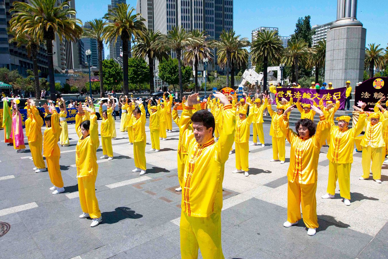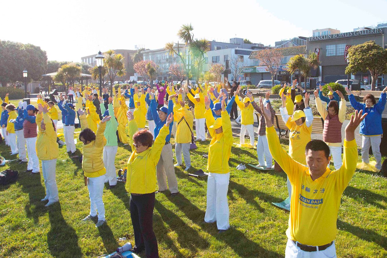 星期六上午八点,法轮功学员首先在旧金山海上花园(Maritime Garden)集体炼功,展示祥和优美的功法。