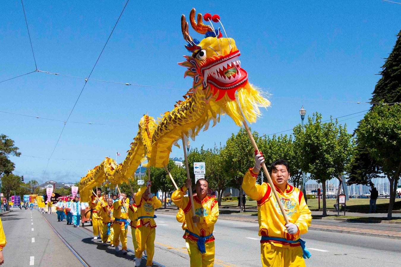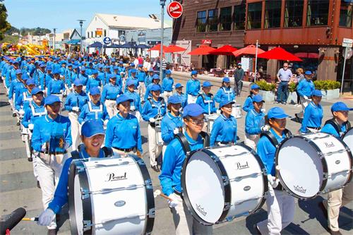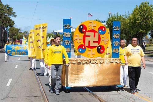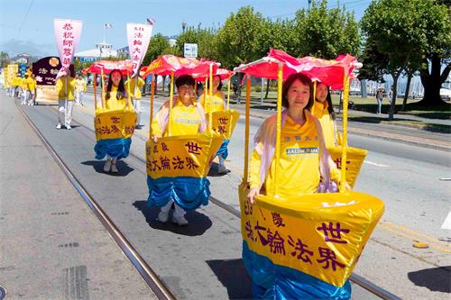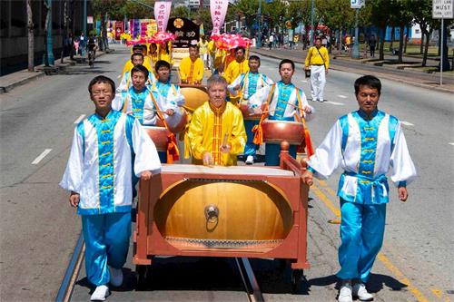 上午十一点,庆祝游行开始。游行队伍由阵容庞大的天国乐团前导,随后是舞龙队,接着是拿着各种横幅的队伍,上面写着:“世界法轮大法日”、“法轮大法好”、“世界需要真、善、忍”等,炼功队伍展示祥和五套功法。还有花车、小花船、舞蹈隊、唐鼓隊 、横幅队及腰鼓队等,浩浩荡荡。