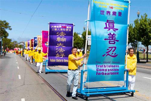 从加拿大西雅图来的黄太太与家人到旧金山旅游,巧遇法轮功学员庆祝法轮大法日活动,当看到法轮功学员游行队伍经过时,驻足拍照。黄太太表示,“哇!今天刚好遇到法轮功的庆祝活动,游行队伍阵容庞大,有舞龙、传统服饰等等,队伍中看到不同年龄层的人,也看到一些不同族裔的人士在游行队伍中,非常震撼,真的是中国人的骄傲啊﹗”