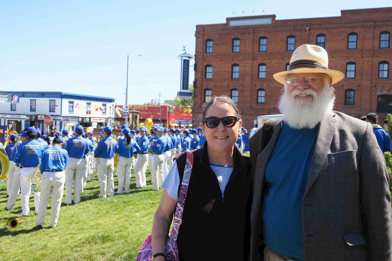 海伦(Helen)和先生罗纳德·潘(Ron Pen)从肯搭基来旧金山旅游,夫妇俩被天国乐美妙的音乐吸引而驻足。海伦表示,“对他们(法轮功团体)的第一印像是非常和善的团体,我能感受到他们是从内心深处所散发出一种愉悦的心情,在庆祝一个非常特别的活动,这也感染了我,让我感到非常的祥和与舒适。”罗纳德说,“对啊,当得知他们是在庆祝一个重要的节日,特别是他们的黄色衣服非常的耀眼,搭配着蓝色的天空,真是一幅美丽的画面。”