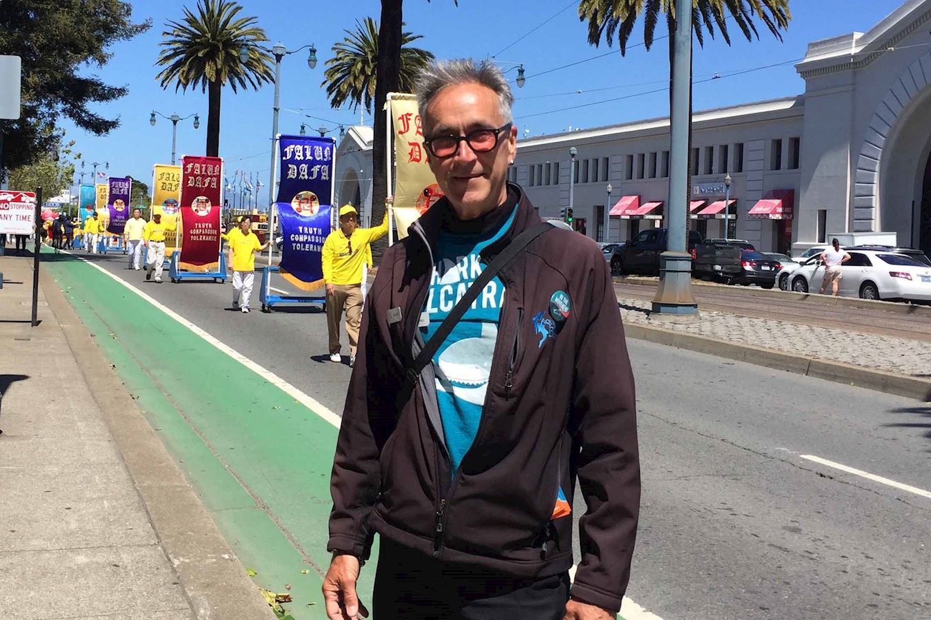 迈克尔·鲁斯卡(Michael Hruska )是渔人码头水族馆的工作人员,当天他看到法轮功学员的游行队伍非常兴奋,马上上前拍照,他对学员说:我每年都看到你们的游行,每次都那么壮观、美丽,让人看了觉得很喜悦。他并表示知道中共迫害中国大陆的法轮功学员,他认为那是不应该的。他说:“真、善、忍是普世价值,这个世上的每个人、每天都应该按照这个来为人、做事。”