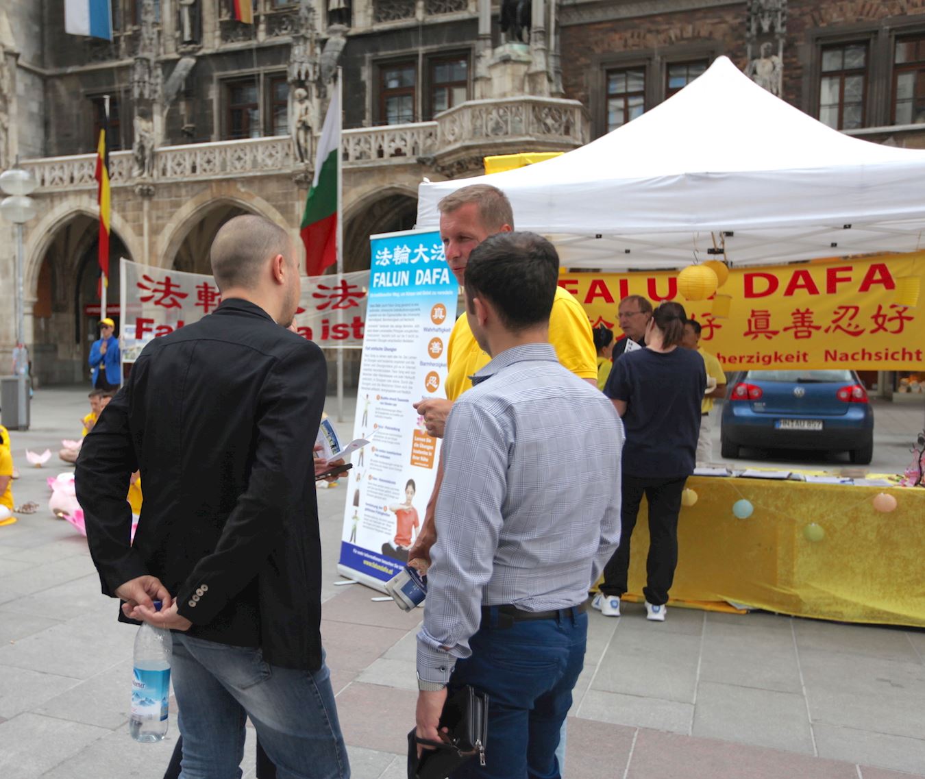 五月十三日,法轮功学员在慕尼黑的玛琳广场(Marienplatz)举办庆祝活动,学员们坐在莲花里,随着悠扬的炼功音乐展示功法演示,让不少民众着迷,不少人打听慕尼黑的炼功点,有些人更是当场就跟着学炼法轮功。