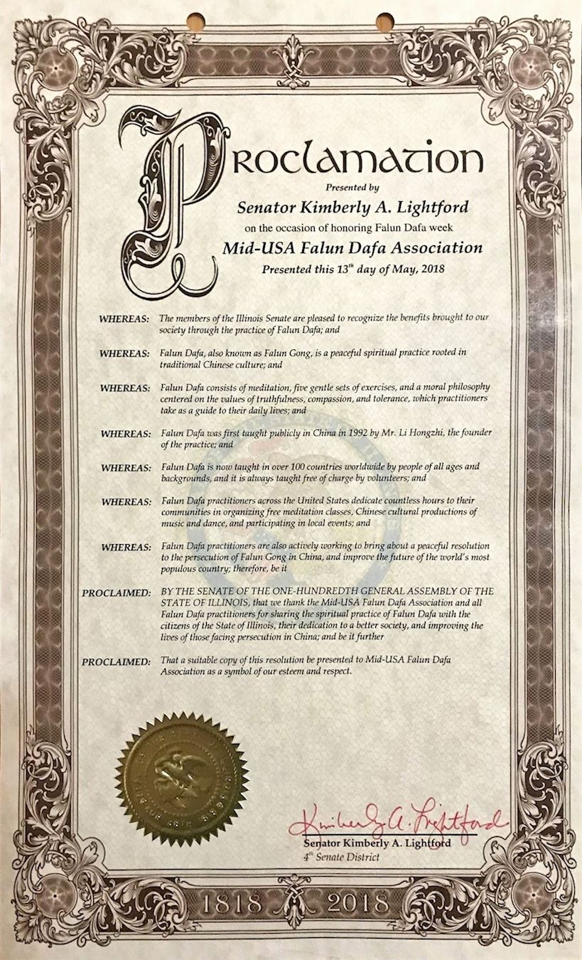 伊利诺伊州第100届参议院感谢美中法轮大法学会和所有法轮功学员,感谢他们将法轮大法这一精神修炼方法分享给伊利诺伊州民众,感谢他们对改善社会、改善那些在中国面临迫害的民众的生活的投入,并且