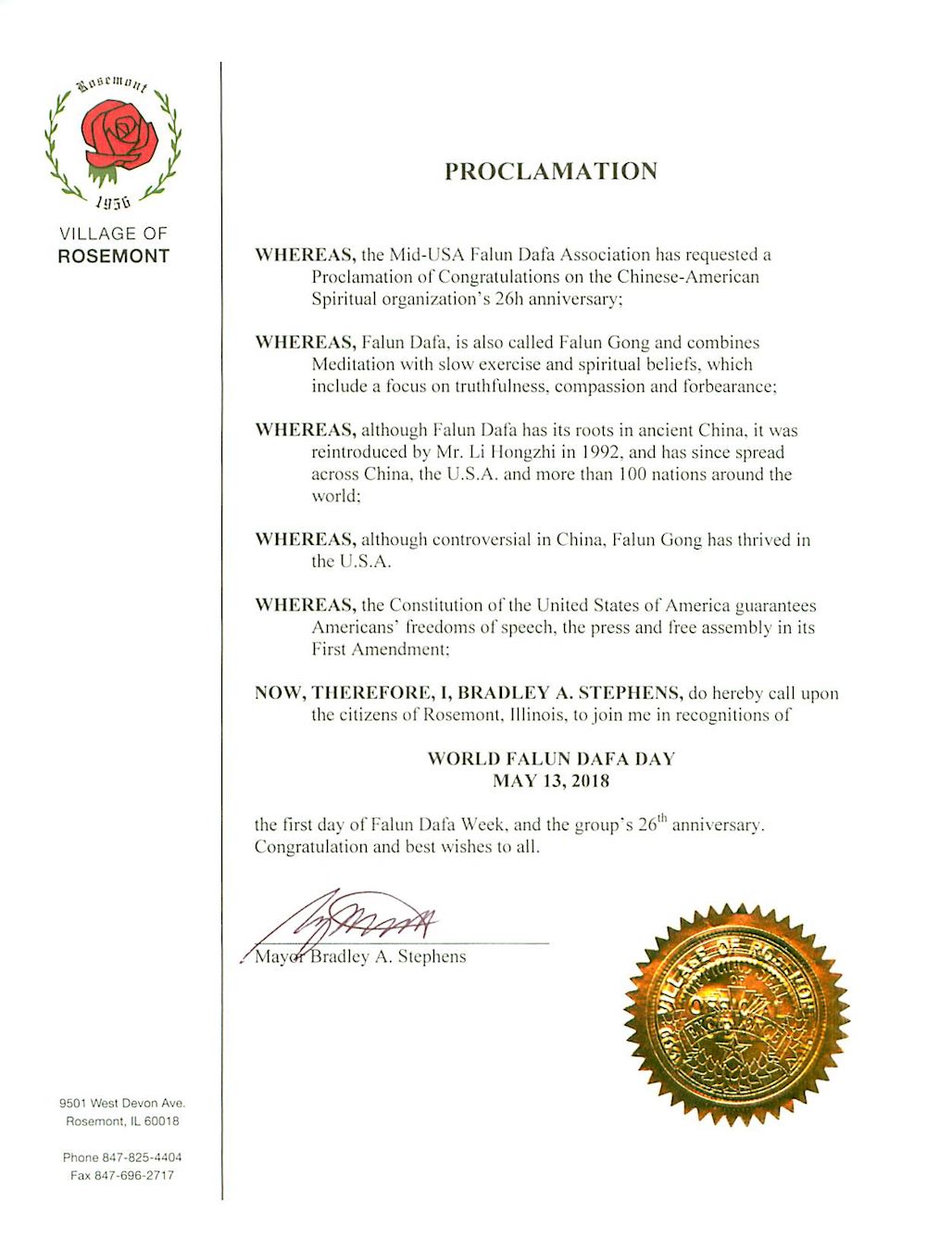 芝加哥西北郊罗斯蒙特市(Rosemont)市长史蒂芬斯(Bradley A Stephens)也颁发了褒奖,宣布法轮大法日。褒奖译文如下: