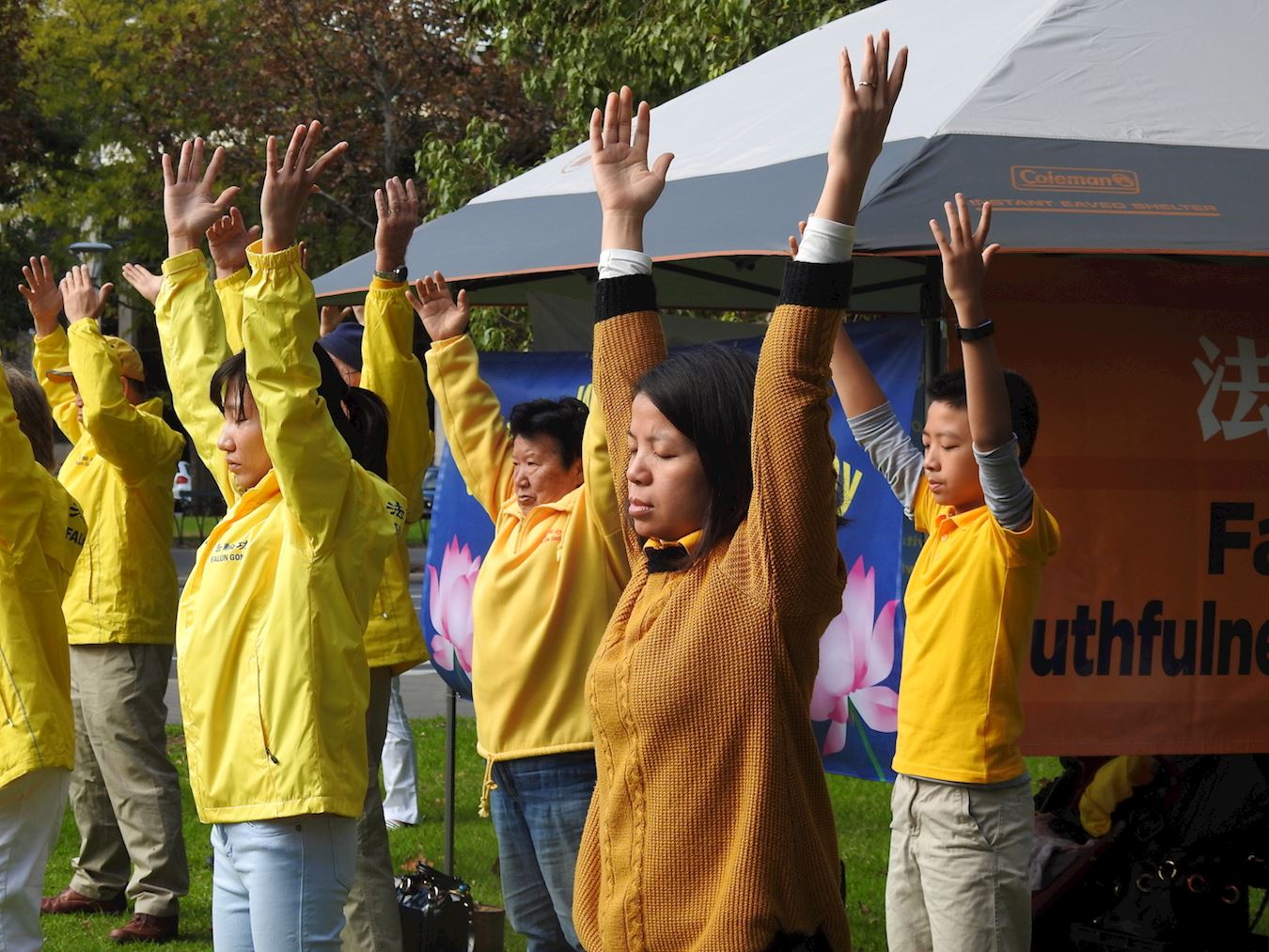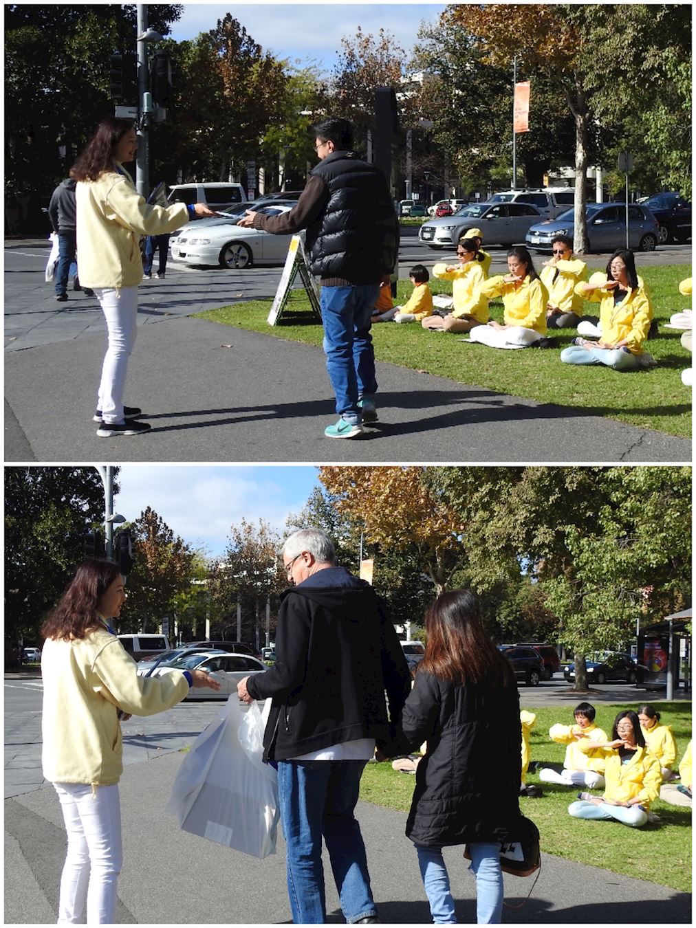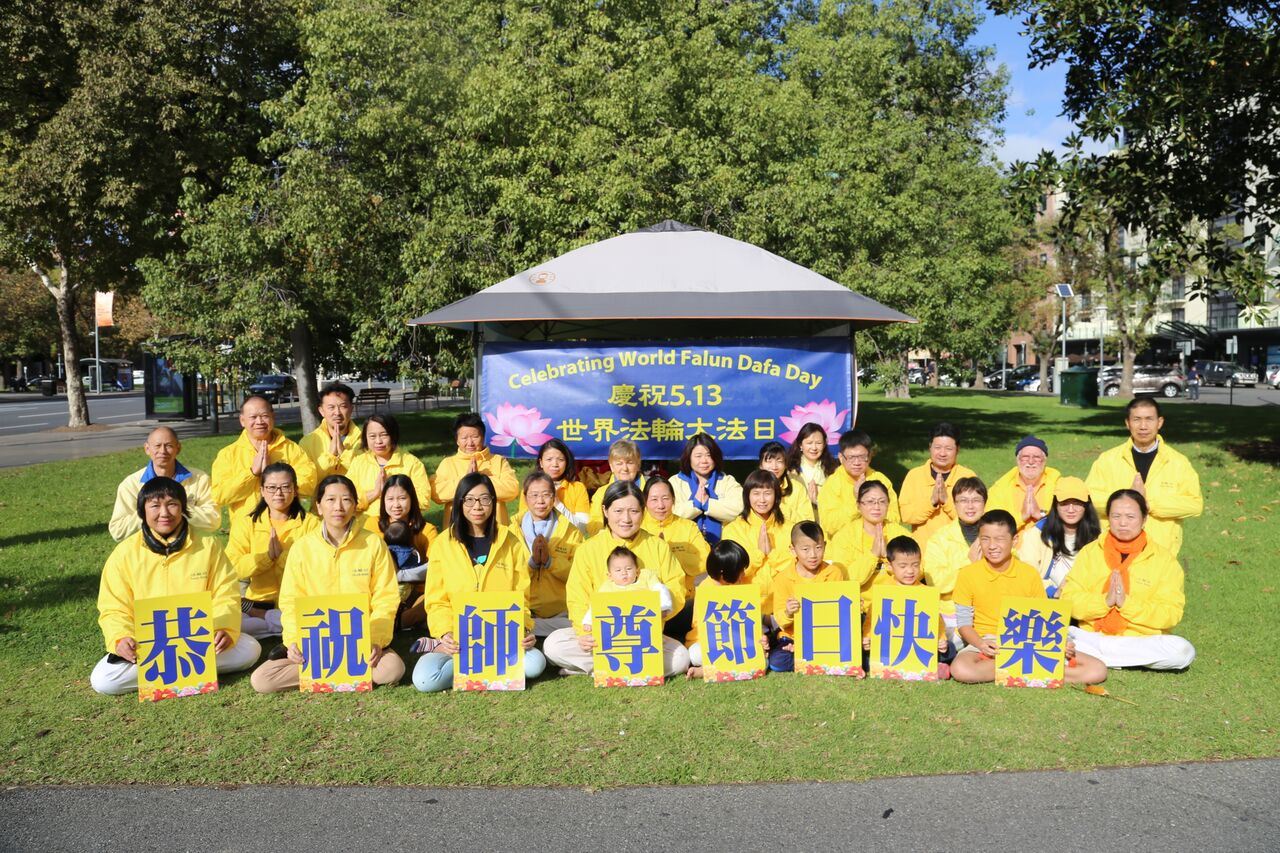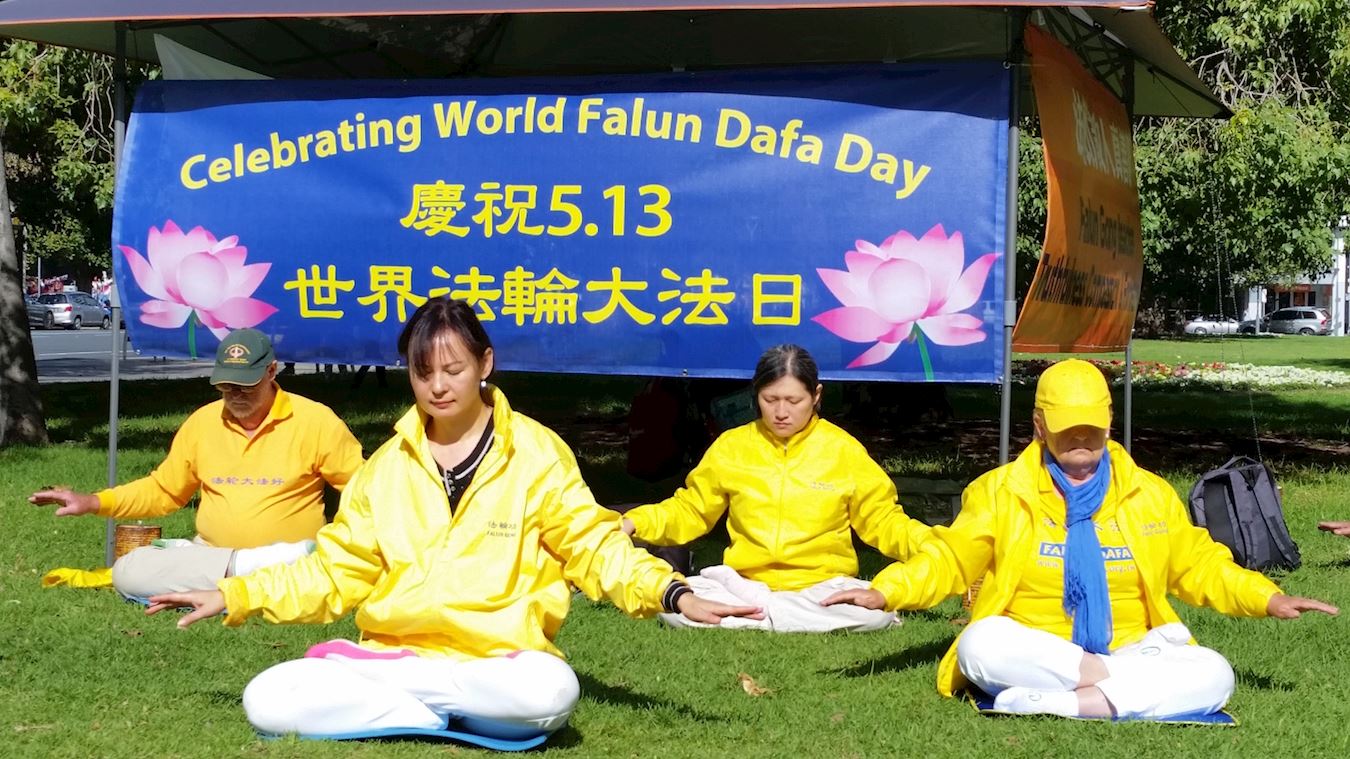 每年的五月十三日是世界法轮大法日,今年是法轮大法洪传世间的26周年。南半球初冬的早晨,阳光灿烂,蓝天碧草,悬挂着的彩色横幅和穿着金黄色炼功服学员们炼功的祥和场面,在车水马龙的市区构成一道亮丽的风景线。过往车辆鸣笛致敬,行人驻足关注。