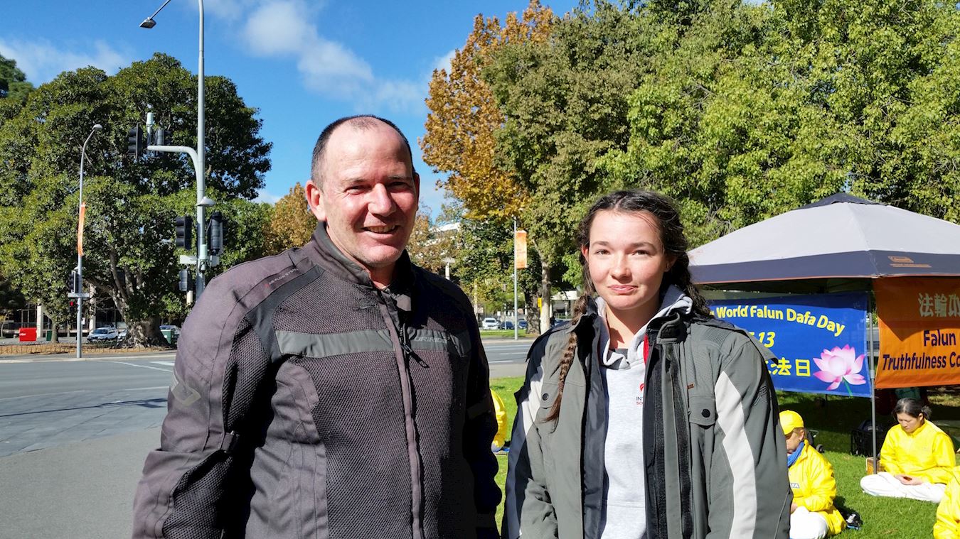 汉娜表示:“在21世纪的今天,还发生活摘人体器官这样的事,真是骇人听闻。”看到学员们的炼功场面,她表示感受到法轮功的祥和平静,感觉很美好。 西人莱克(Luck)也是第一次知道活摘器官的事,觉得必须要做点什么,他毫不犹豫地在制止迫害法轮功的请愿书上签了字。他认为,应该让更多人知道这些事情,这很重要。