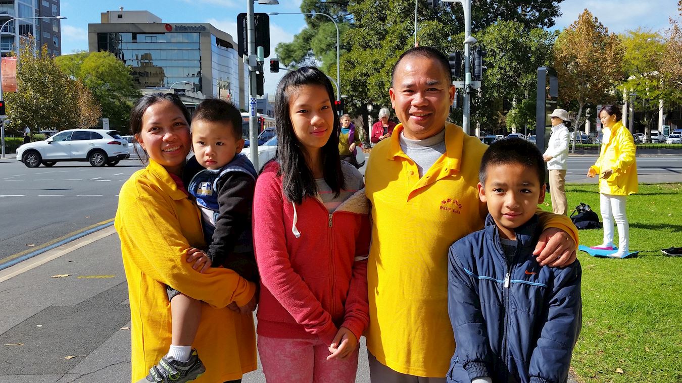 家住南澳赫莱登公园(Cryden Park)的德鲁(Druong)和太太带着全家来参加庆祝,“我是在网络上读到大法书籍的,真善忍深深地打动了我,我修炼法轮大法一年了,修炼后我有很多变化,以前有时自私,修炼后更多想到其他人,更多以宽容的心善待人。现在全家都炼功,家庭更和睦,遇事再不像过去一样争吵。”太太特拉(Thoa)看到先生的变化,也和孩子们一起加入了修炼。今年是第一次给师父拜寿,他们全家人对师父说:“感谢师父把大法传给我们。祝师父生日快乐。”