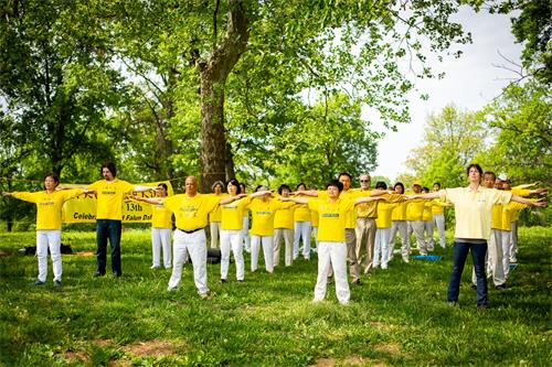 '图1~2:圣路易法轮功学员在当地著名景点森林公园集体炼功,庆祝法轮大法日。'