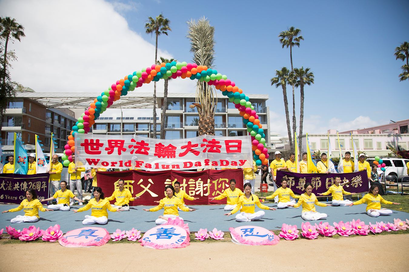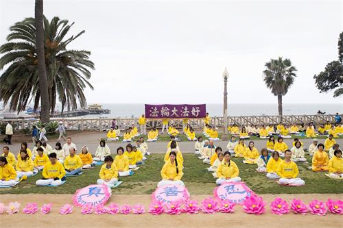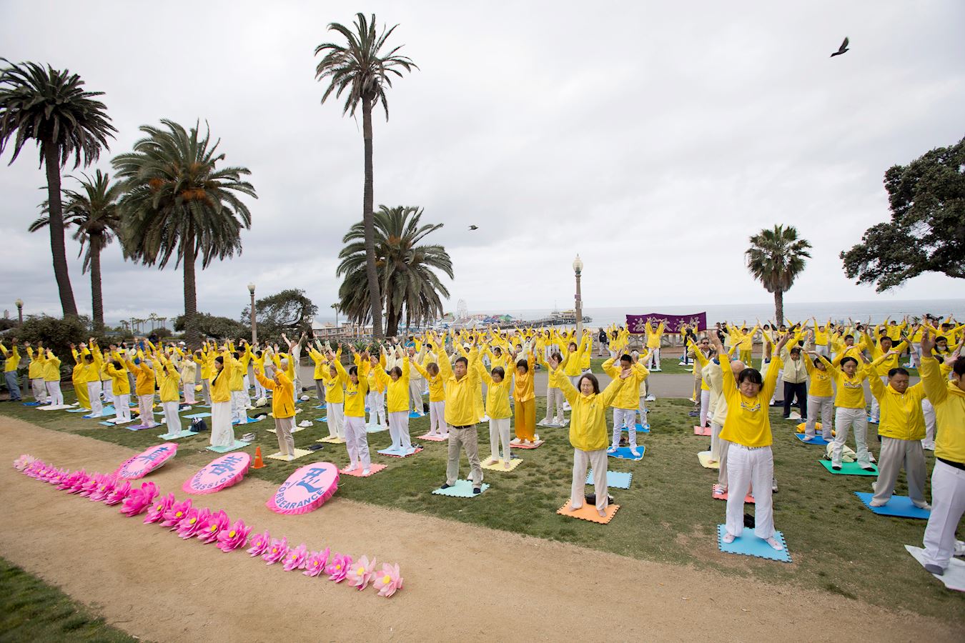 当日早上,洛杉矶地区部份法轮功学员来到游客如织的圣莫妮卡海滩(Santa Monica Beach),伴随着祥和的炼功音乐,集体炼功,“缓、慢、圆”的功法吸引了众多游客的目光,不少民众拿起手机拍照、合影,还有人竖起大拇指称好。