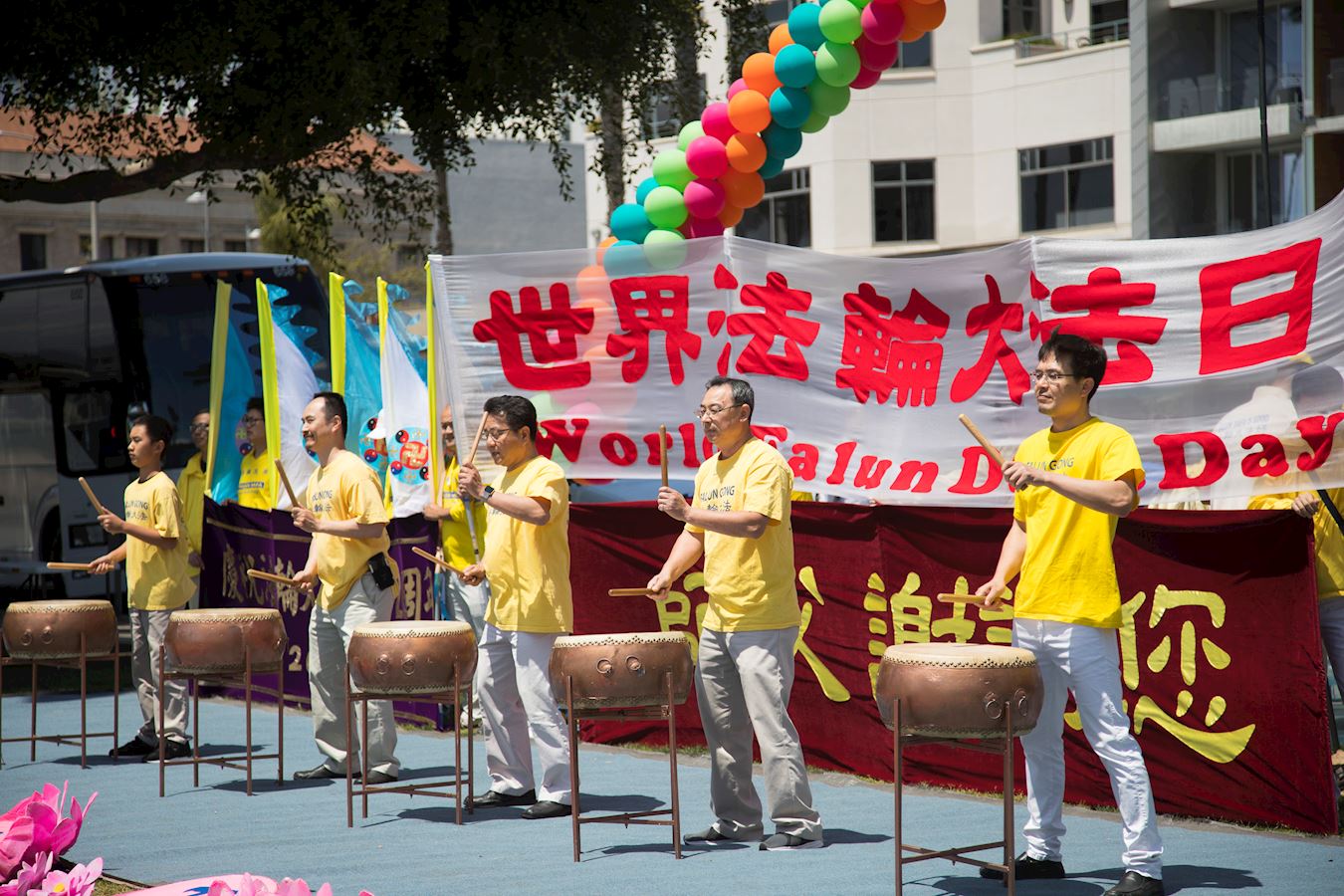 '图6~8:集体炼功结束后,洛杉矶的学员继续进行了文艺表演,他们以歌声、舞蹈传递对大法师父李洪志先生真挚的感谢。'