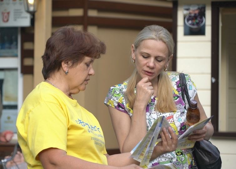 ![]() 图6~7:路人认真听法轮功学员讲真相 |