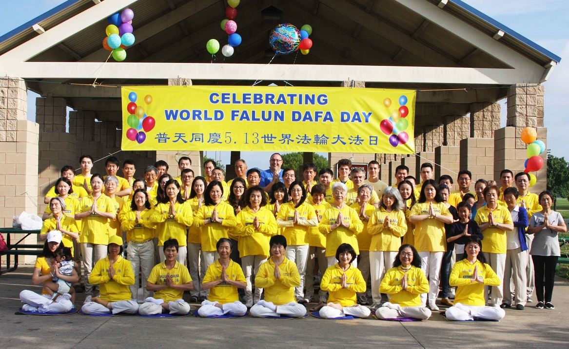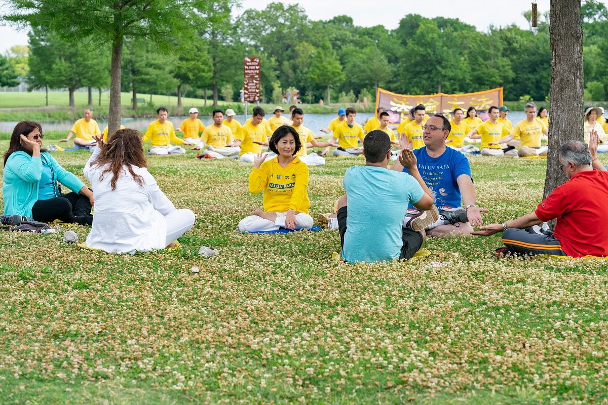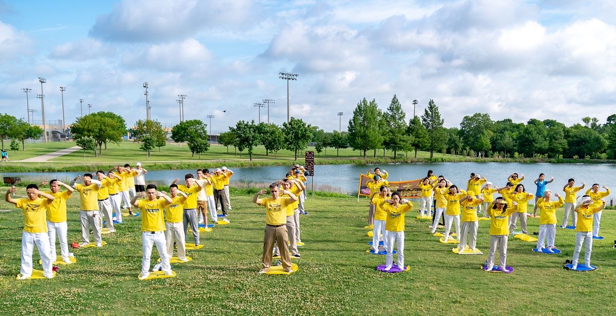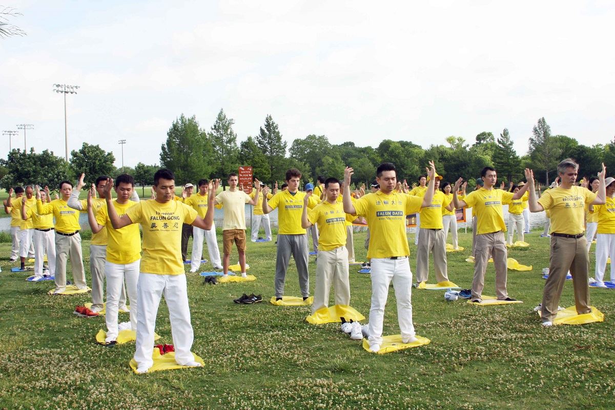 【明慧网二零一八年五月十六日】(明慧记者曾洪美国达拉斯报道)二零一八年五月十三日,美国达拉斯-沃斯堡地区的法轮功学员聚集在布兰诺市(City of Plano)的Russell Creek公园集体炼功,庆祝法轮大法洪传世界二十六周年,第十九届法轮大法日,恭祝师父华诞。