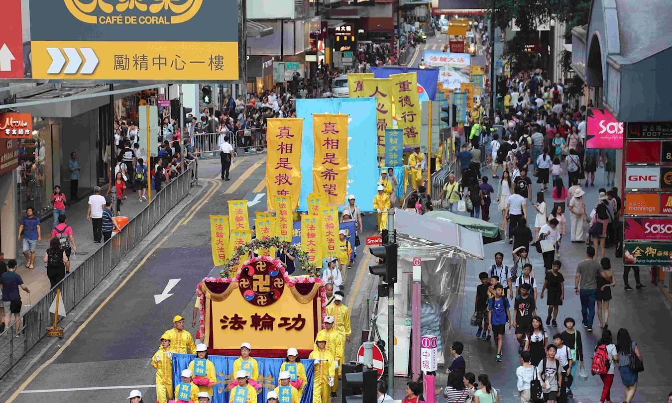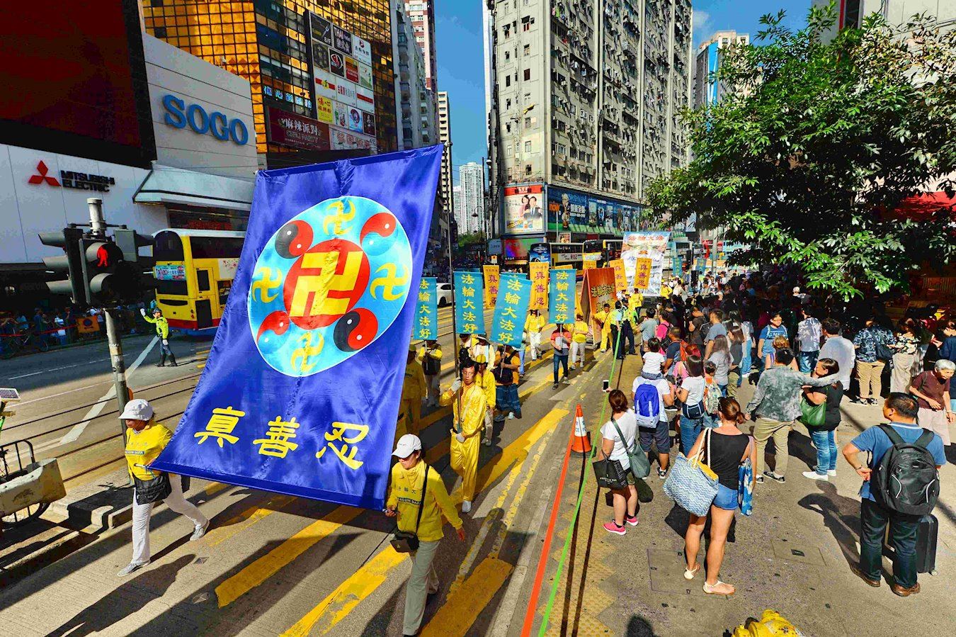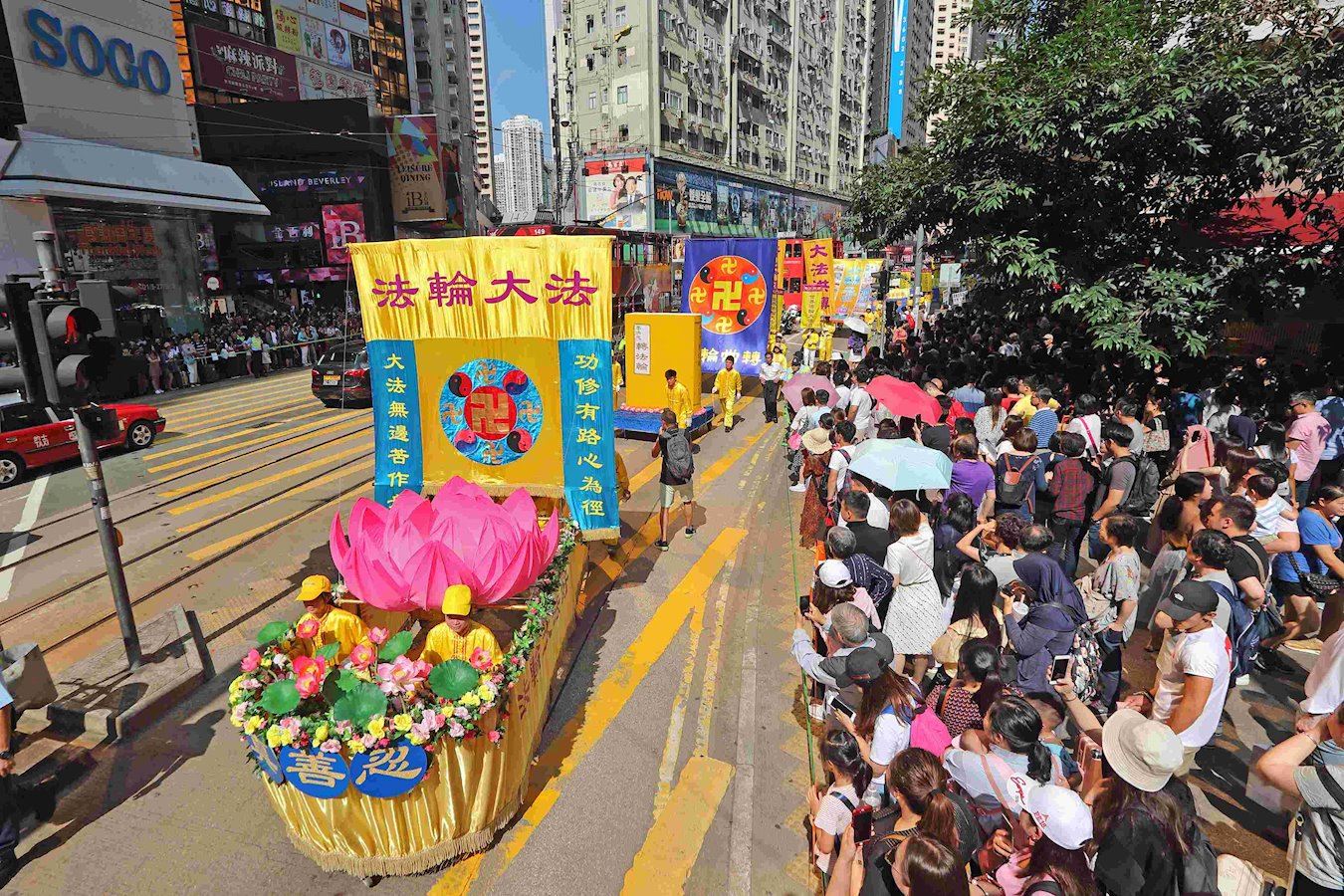 下午二时,游行队伍由港岛区北角英皇道游乐场出发,沿着轩尼诗道、皇后大道中,途经铜锣湾、湾仔、金钟及中环等著名购物区,前往终点上环中山纪念公园。游行分为“大法洪传 普天同庆”、“法轮大法和平之路”、“天灭中共 三退是福”等方阵。壮观的天国乐团奏乐引领队伍,其后有色彩缤纷的法船、身穿柔美传统汉服的仙女队、法轮功著作《转法轮》巨型模型,与功法展示队、旗鼓队、腰鼓队等,幡旗横幅让人目不暇接,吸引许多市民及游客观看,很多人拿着手机拍摄。