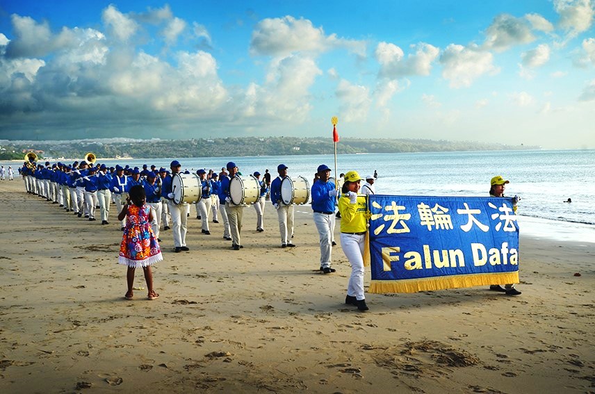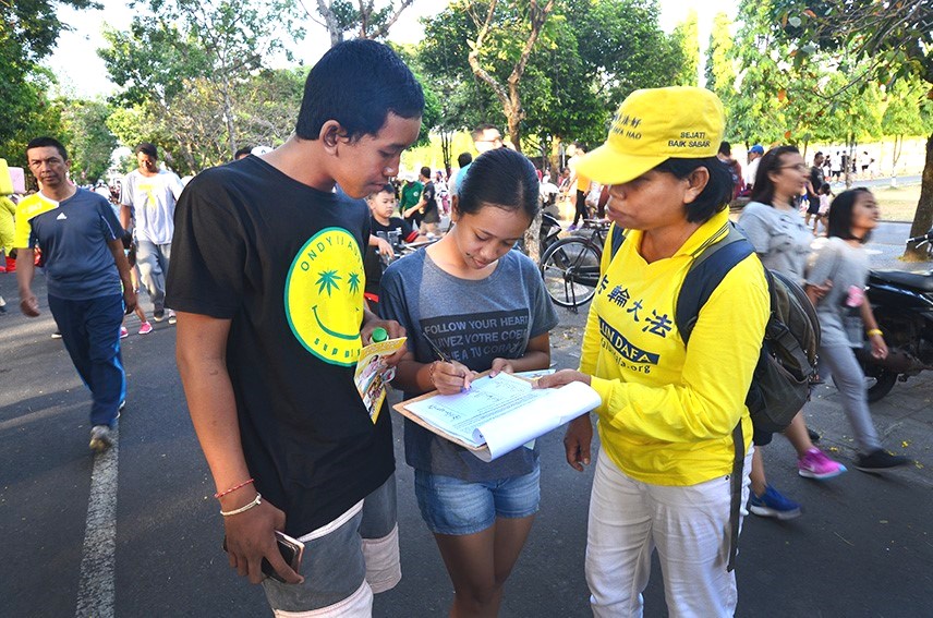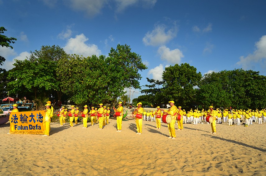 【明慧网二零一八年五月十七日】二零一八年五月十三日,印尼峇里岛法轮功学员举办系列活动,庆祝世界法轮大法日、法轮大法弘传世界二十六周年暨法轮功创始人李洪志大师六十七华诞。活动分为三个部分,从早上六时开始到傍晚六时结束。第一部分是集体炼功和游行,第二部分是集体学法,第三部分是天国乐团和腰鼓队在景点表演,并向民众征集签名,谴责中共对法轮功的迫害