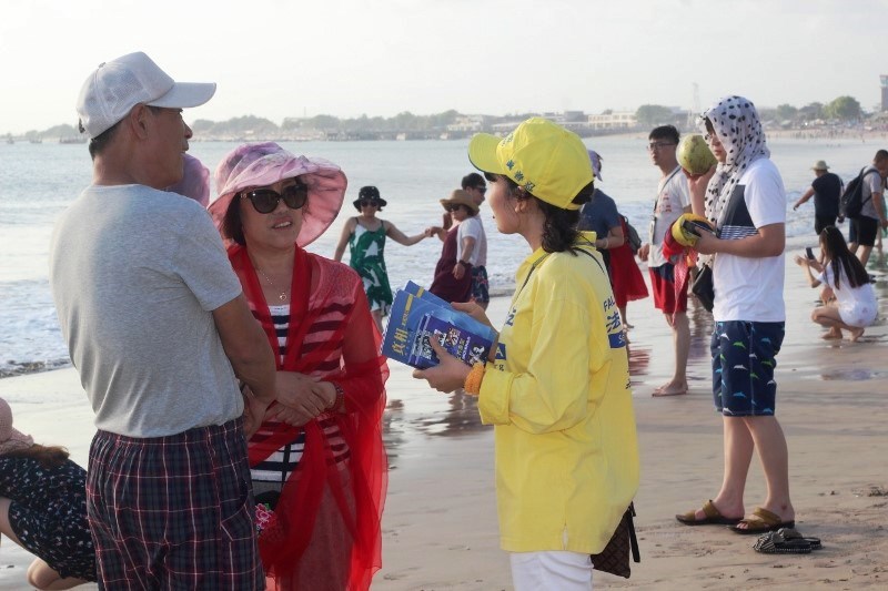 图7:法轮功学员在著名景点格东岸(Kedongan)海滩向游客讲真相