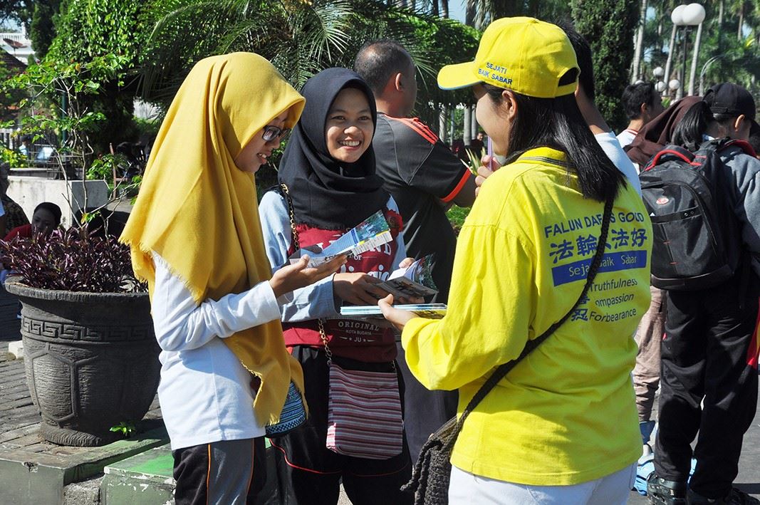 爪哇东部的玛琅市(Malang)、泗水市、诗都阿佐(Sidoarjo)、岩望(Pasuruan)等地区法轮功学员,4月29日在玛琅市的无车日城区,提早庆祝世界法轮大法日。很多接受真相资料的人们表示,他们是第一次听闻法轮功,很希望了解更多信息。