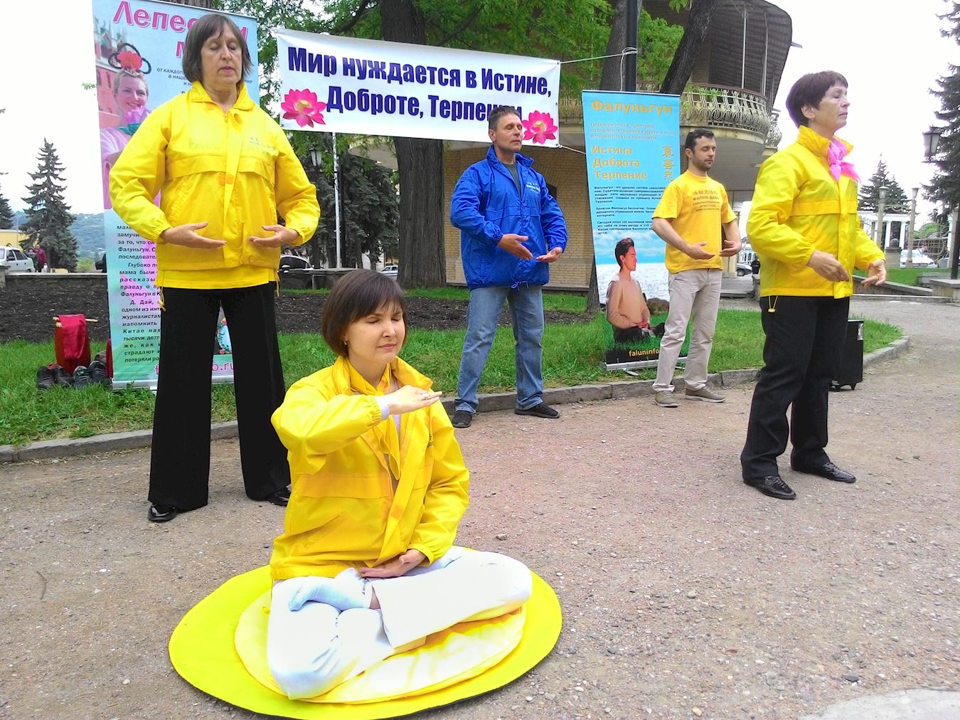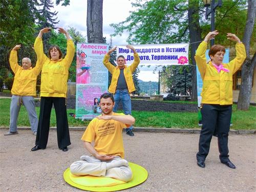 二零一八年五月十三日,在北高加索地区的五山城(Pyatigorsk)的花坛公园,法轮功学员向当地民众介绍法轮功,展示五套功法动作,并以腰鼓和舞狮等活动与民众共同庆祝世界法轮大法日。