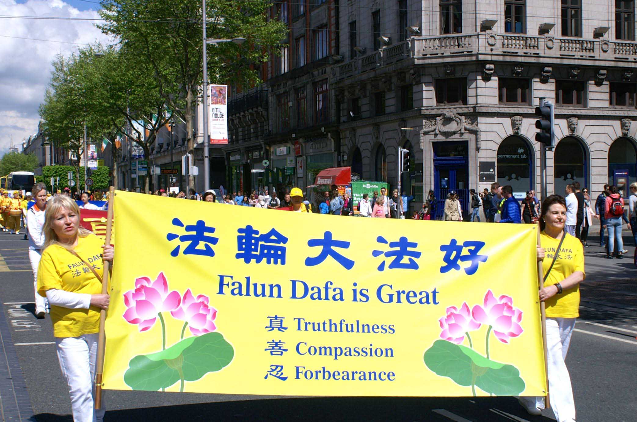 【明慧网二零一八年五月十七日】二零一八年五月十二日,爱尔兰法轮功学员在都柏林市中心举行了庆祝“五一三”世界法轮大法日的游行集会,同时祝贺法轮功创始人李洪志先生生日快乐。游行队伍由小弟子舞蹈队、男学员的唐鼓队和展现“法轮大法好”等内容的横幅队组成。