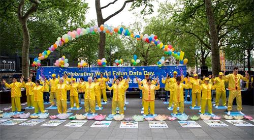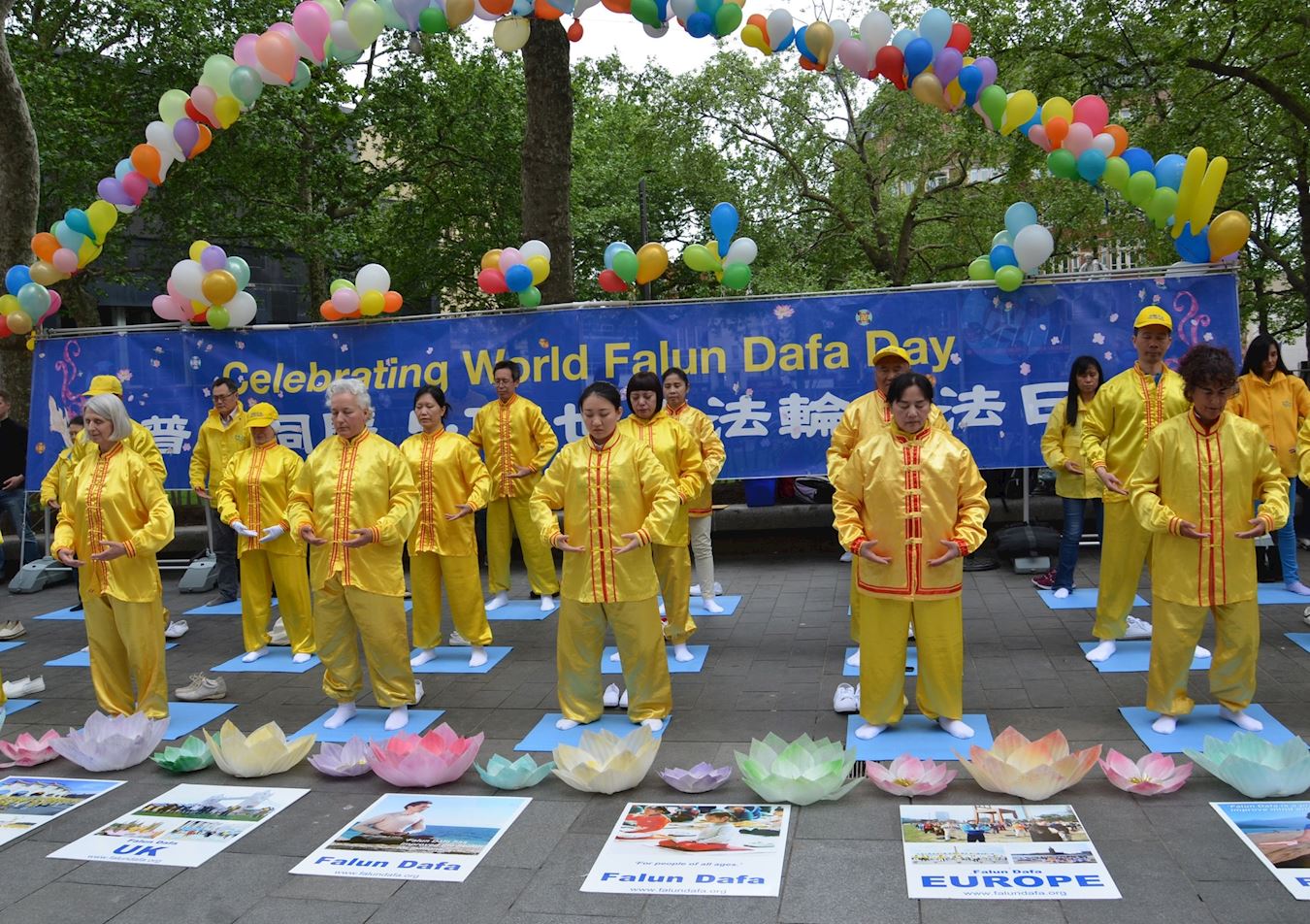 ![]() 图1:五月十三日,英国法轮功学员在伦敦唐人街旁的莱斯特广场庆祝“世界法轮大法日”,表达对李洪志师父的感激。 |