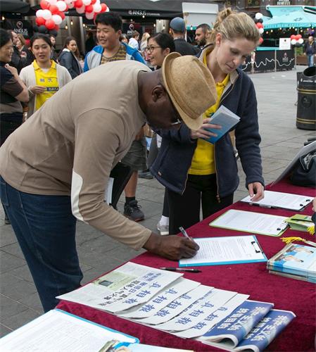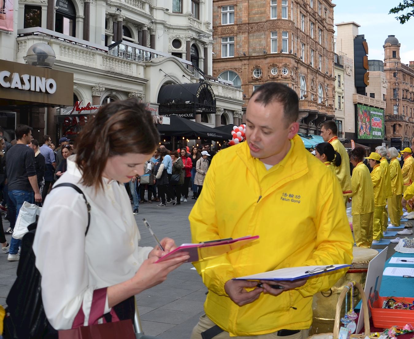 许多路人认真阅读真相传单,有的表示法轮功功法让他们感受到平和宁静,也有的向学员询问如何学炼法轮功。经过广场的华人很多都接过真相资料,听学员讲法轮功真相,向学员询问,解除疑惑。不少留学生及游客表示要“三退(退出中共的党、团、队组织)”。