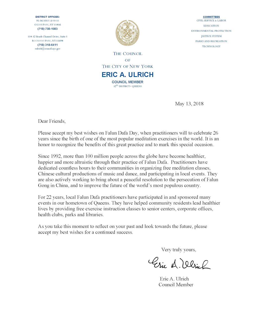 ![]() 图6:皇后区第三十二选区市议员埃里克·乌尔里希(Eric Ulrich)发来贺信赞扬大法造福人类。 |