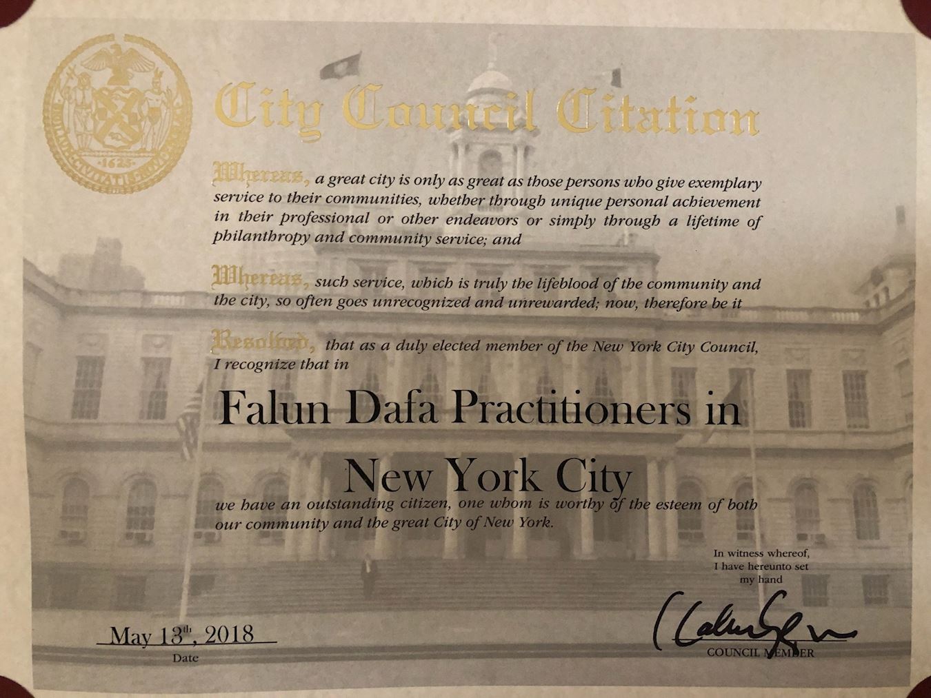鉴于:这个立法机构自豪并谦卑的褒奖法轮大法(法轮功),在他们庆祝二零一八年五月十三日世界法轮大法日和二十六周年庆典之际;并且