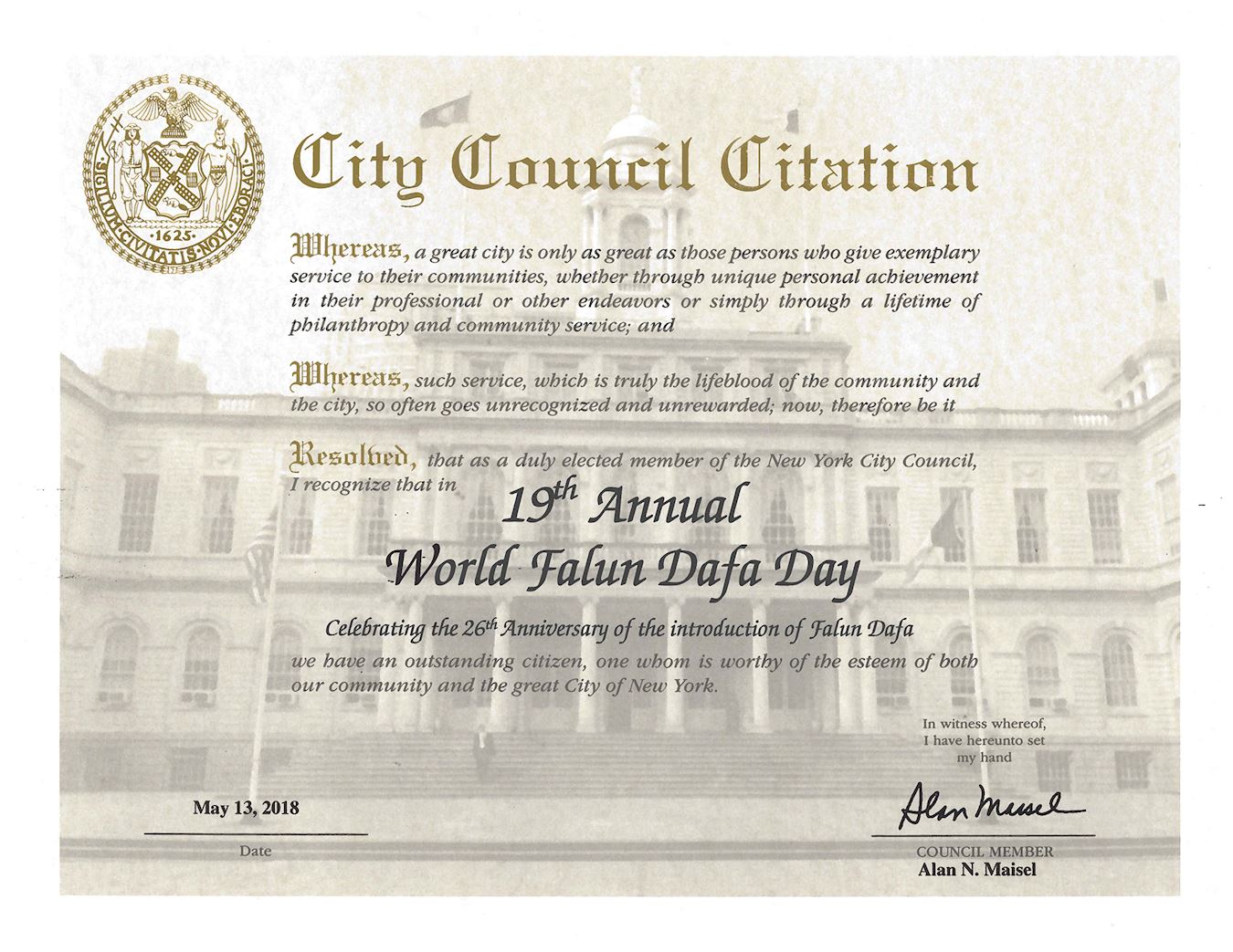 在第十九届世界法轮大法日之际,我写信向我所在地区和纽约市的法轮大法修炼者致以热烈的问候和诚挚的祝贺,你们坚持不懈的向这个城市的居民传播健康、福祉和文化的付出值得承认。