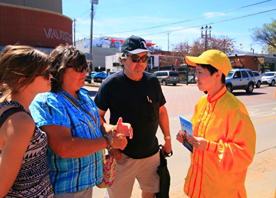 活动最后,法轮功学员们一起恭祝师尊生日快乐。清风拂面,阳光和煦,公园里一片生机勃勃,弟子们齐声向师父祝福:“恭祝师尊生日快乐!法轮大法好!真善忍好!”