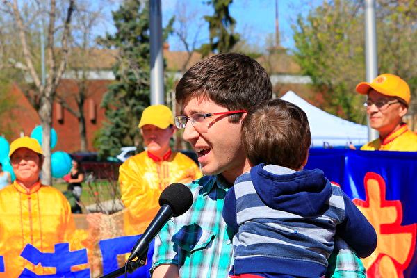 埃德蒙顿国会议员Garnett Genuis出席了庆祝活动。他在活动上致辞:“今天我有幸与幼子在这里和大家共同庆祝第26届法轮大法日。同时,纪念正在被中共迫害的法轮功学员。我们绝不容忍中共对人权的侵犯,其中包括对法轮功学员、藏族、维吾尔族、基督教徒与政治犯等的迫害。”