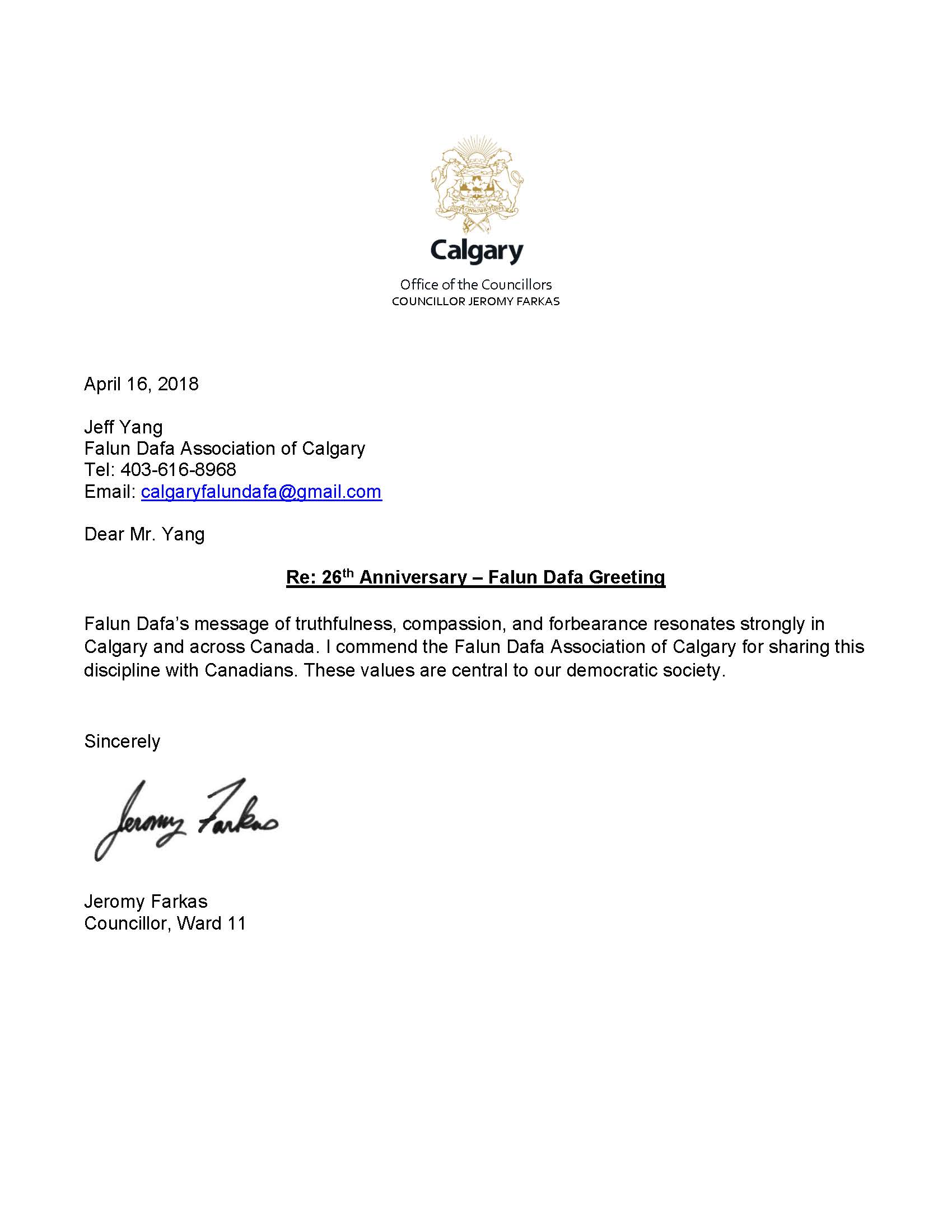 卡尔加里第十一区市议员Jeromy Farkas在贺信中表示:“法轮大法向民众展现的真、善、忍,在卡尔加里和整个加拿大引起强烈反响。我赞扬卡尔加里的法轮大法学会与加拿大人分享这个理念,这些价值观是我们民主社会的核心。”