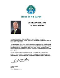 亚省Spruce Grove市市长Stuart Houston在贺信中表示:“我代表Spruce Grove市,以最美好的祝愿恭贺法轮大法洪传26周年。