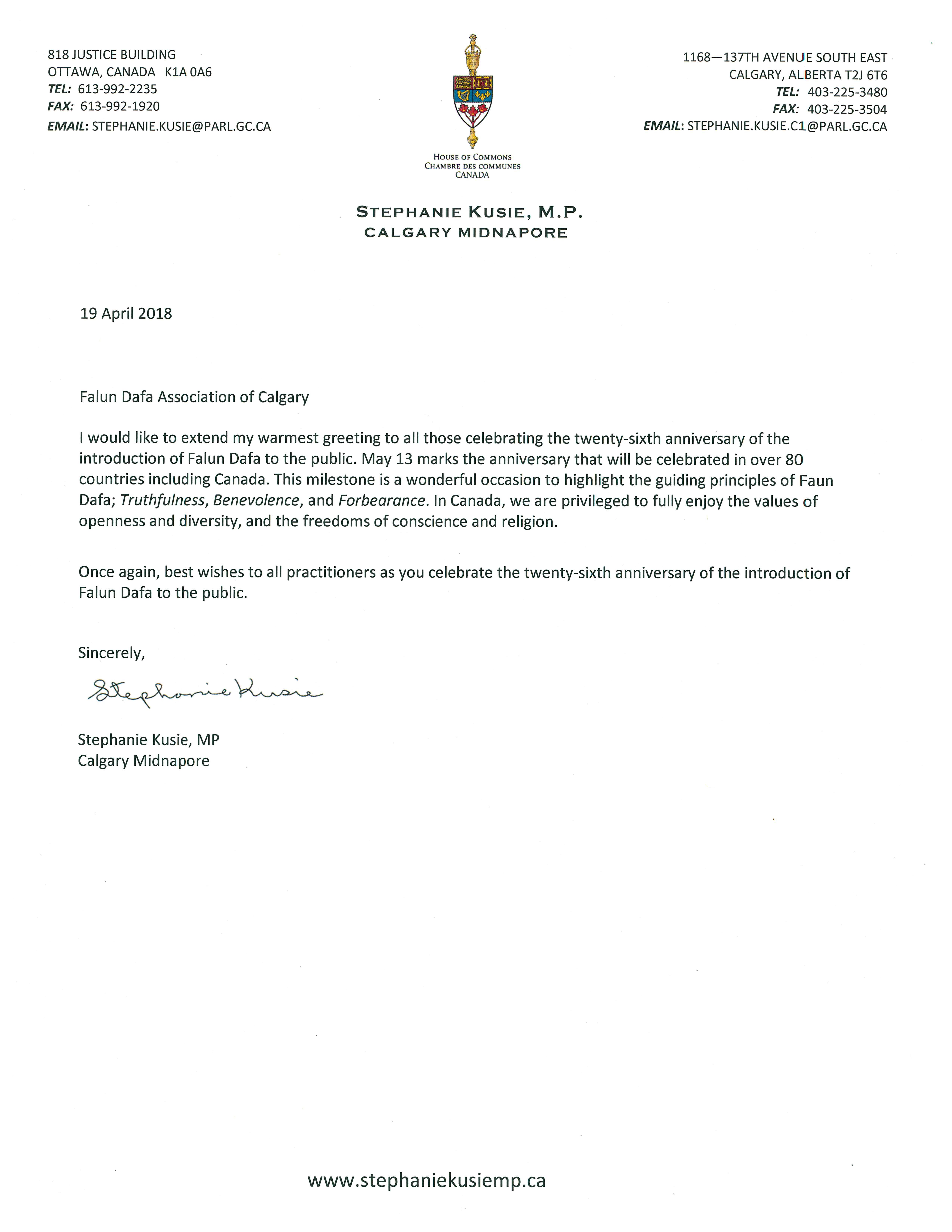 国会议员Stephanie Kusie:向法轮大法修炼者致以最美好的祝愿!