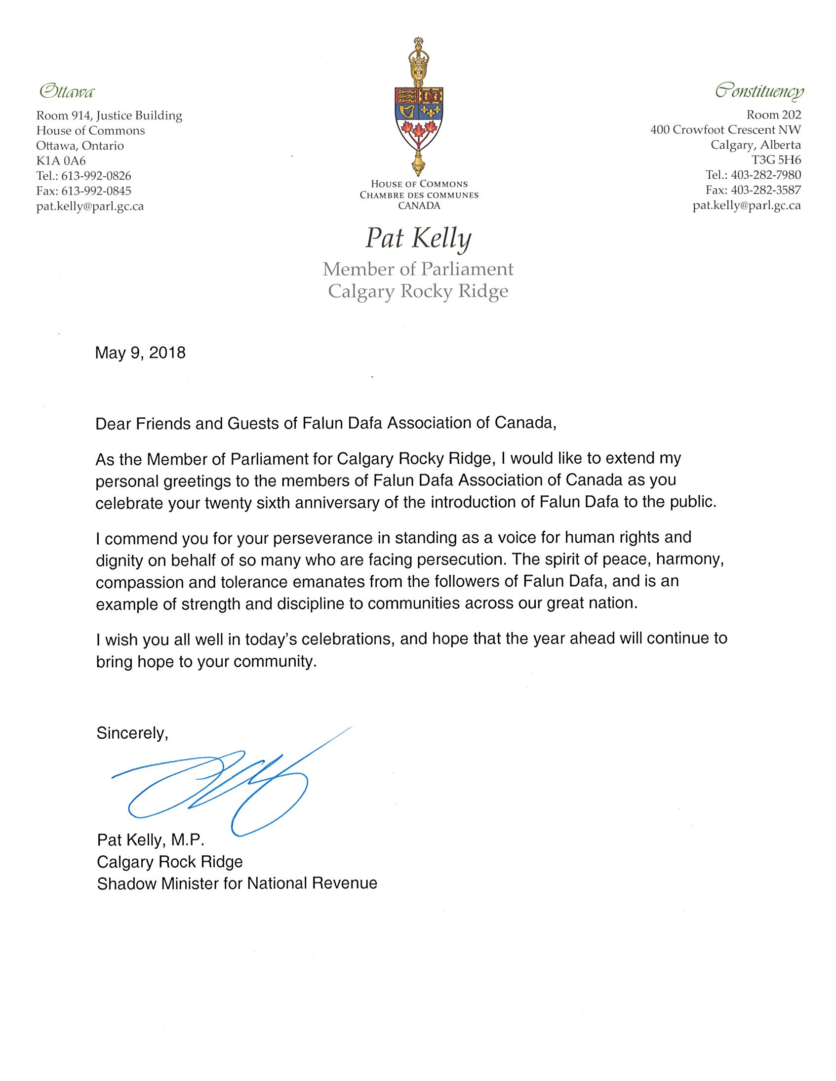 卡尔加里-Rocky Ridge选区国会议员Pat Kelly在贺信中表示:“作为卡尔加里Rocky Ridge选区的国会议员,值此法轮大法洪传于世26周年之际,向全加拿大的法轮大法修炼者致以最热烈的祝贺。