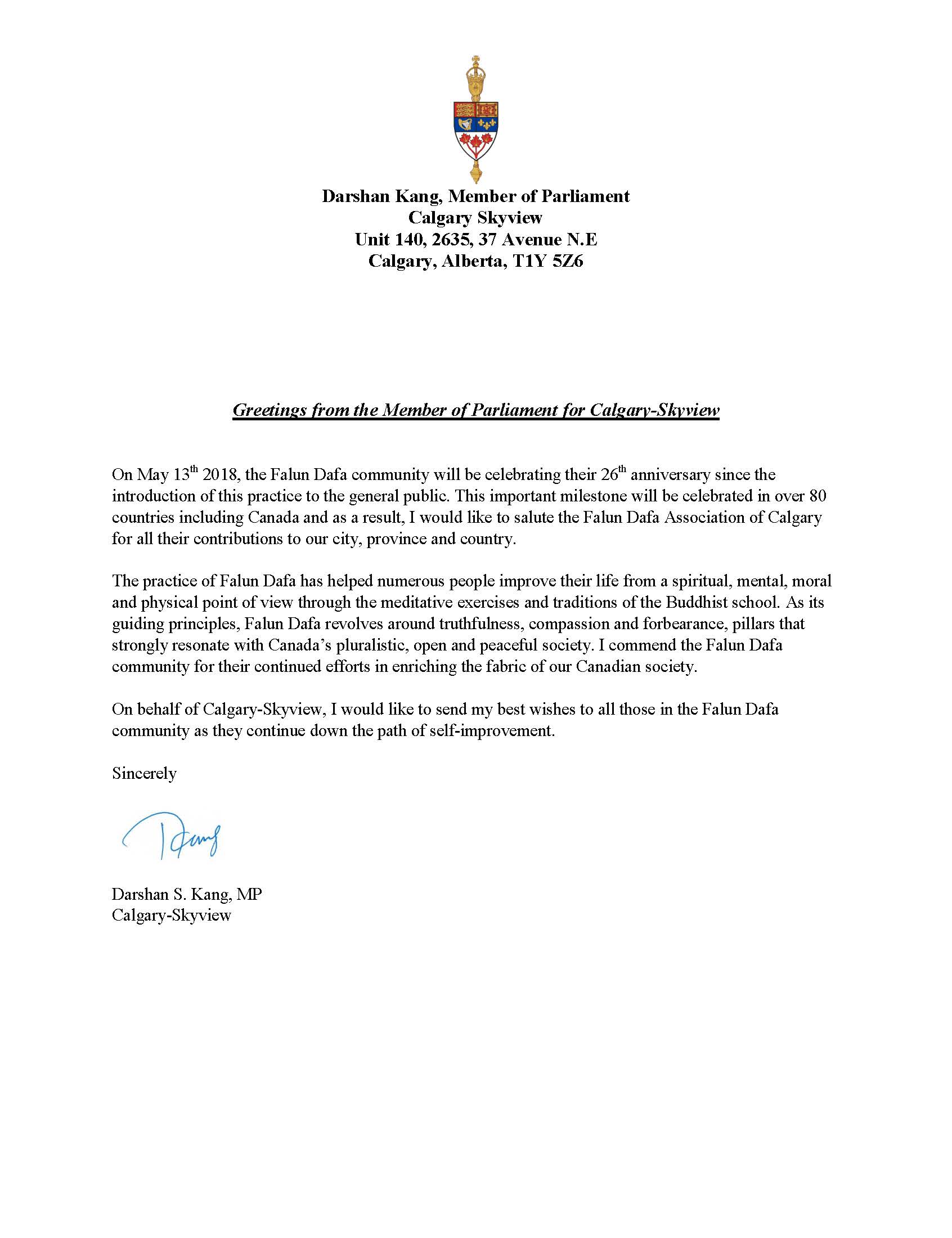 卡尔加里-Skyview选区国会议员Darshan S. Kang在贺信中表示:“2018年5月13日,法轮大法弘传世界26周年,全球包括加拿大有超过80个国家共同庆贺这一重要的里程碑。在此,我要向卡尔加里法轮大法学会为我们的城市、亚省及国家作出的贡献致敬。