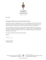 法轮大法通过静坐功法和传统佛家思想帮助人们从精神、心理、道德和身体方面改善他们的生活。法轮大法以真、善、忍为指导原则,突出体现了加拿大多元化、开放和和平的社会价值。我赞扬其持续为丰富加拿大社会的结构作出的贡献。