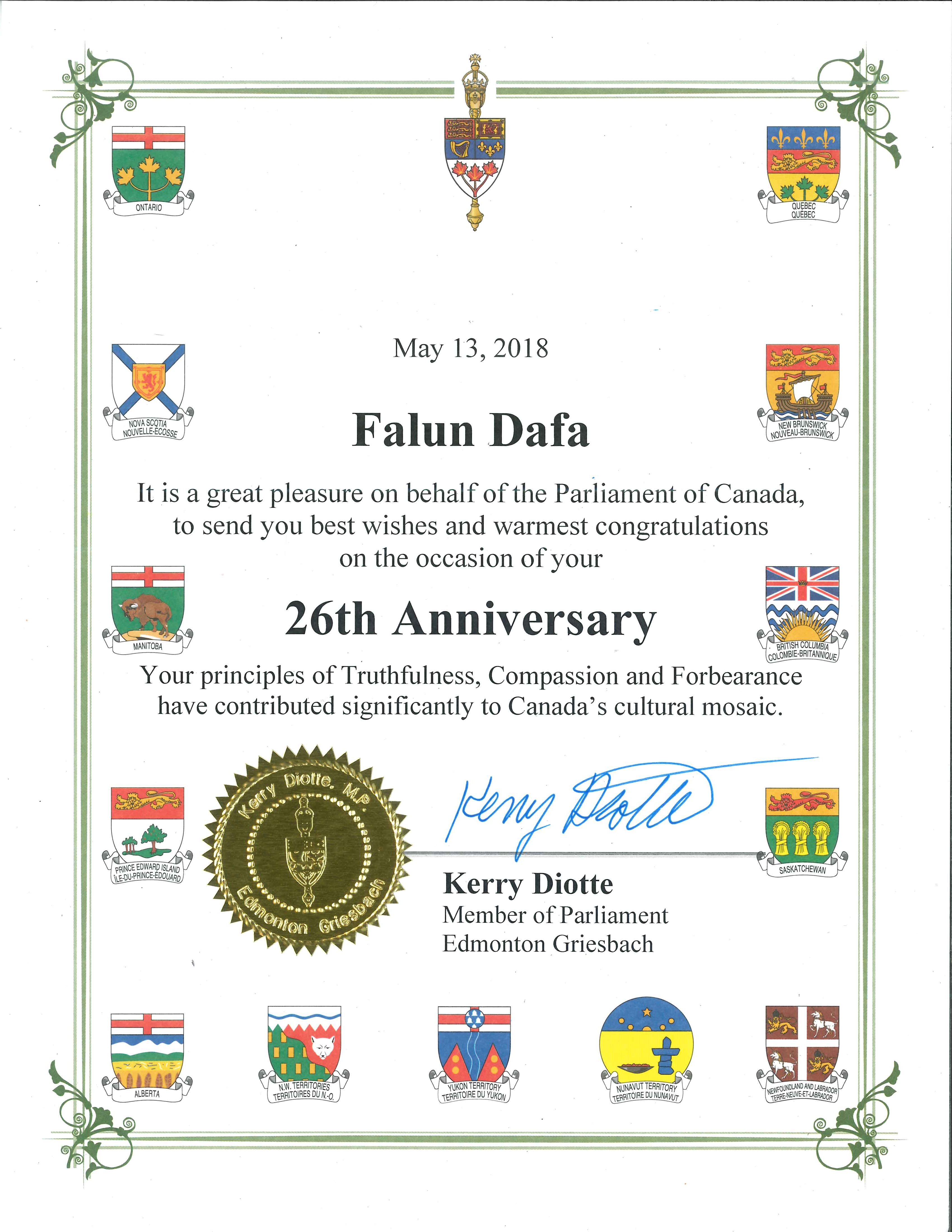 埃德蒙顿-格里斯巴赫选区国会议员Kerry Diotte在贺信中表示:“很高兴代表加拿大国会在你们庆祝法轮大法洪传26周年之际,送上我们最美好的祝愿和最热烈的祝贺。