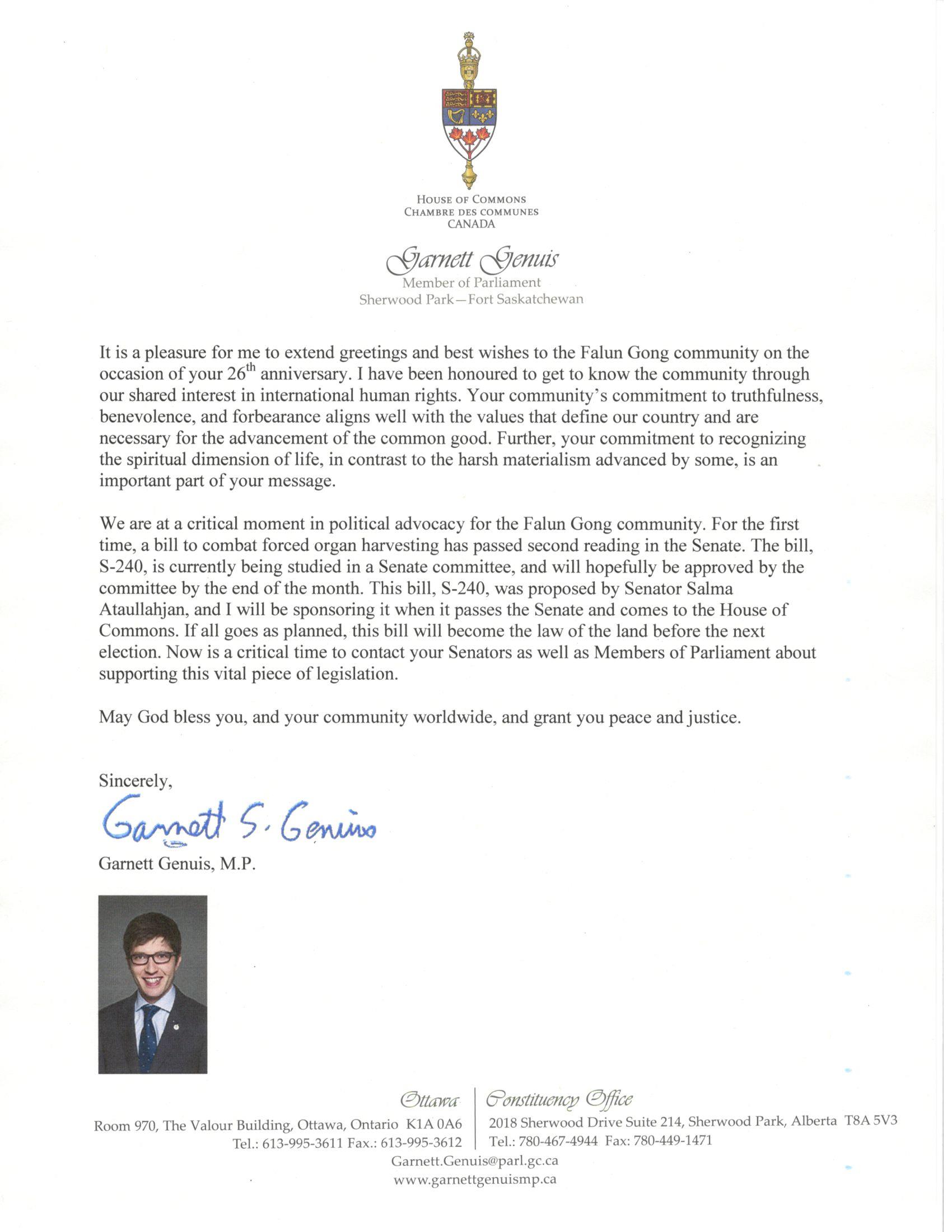 国会议员Garnett Genuis:向法轮功团体致以问候和良好的祝愿
